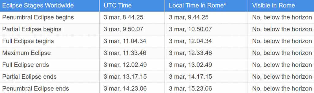 Ecco in dettaglio tutte le fasi della prossima eclissi totale di Luna, in uno specchietto realizzato da Timeanddate che riporta, per ogni passaggio, ora UTC e ora italiana: