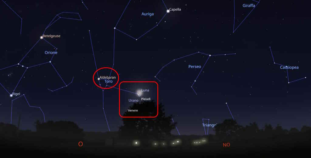 Sebbene il nostro satellite naturale, dopo aver raggiunto la fase di Luna Nuova appena due giorni prima, non possa garantire grande luminosità all'evento, potremmo contare sulla luce emanata da Venere, che rappresenta il secondo Pianeta più luminoso del Sistema Solare. A dare visibilità a questo evento ci penseranno poi la stella Aldebaran, l'astro lucente della costellazione del Toro, e le mitiche Pleiadi.