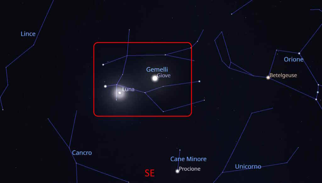 Ad appena 24 ore di distanza saranno invece Luna e Giove a incontrarsi nella costellazione dei Gemelli. La sera del 27 febbraio il nostro satellite naturale, ormai prossimo alla fase di Piena, sarà illuminato all'84,6% e la sua luce sarà accentuata da quella delle stelle Castore e Polluce che osserveranno dall'alto la scena.