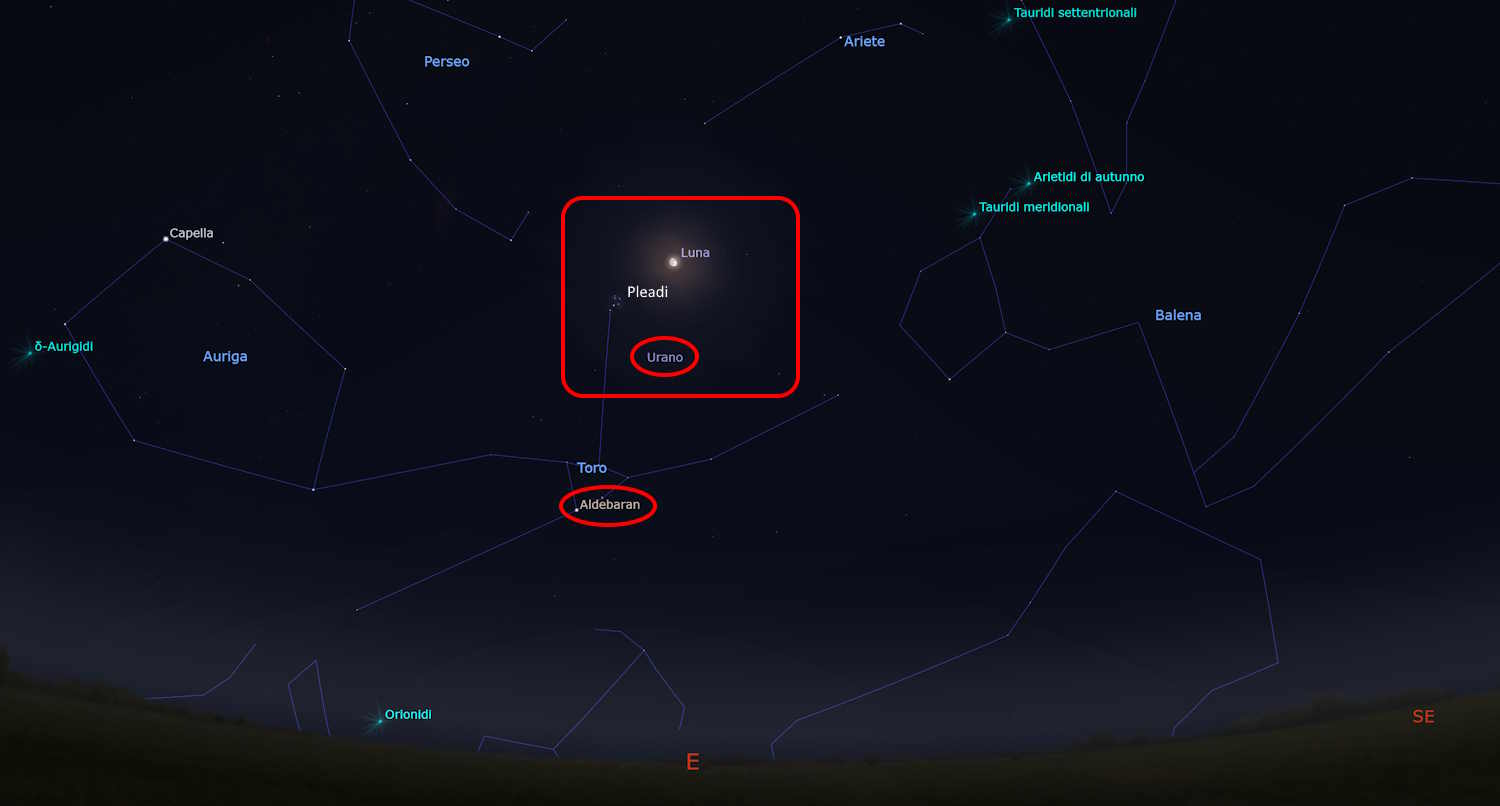 Entrambe le sere, se il meteo sarà clemente, sarà possibile osservare i due corpi celesti a occhio nudo. Il nostro satellite apparirà ben illuminato, reduce dal plenilunio dello scorso 7 ottobre. Poter contare su un buon telescopio tuttavia, permetterà di estendere lo spettacolo visto che anche Urano si troverà vicino a Luna e Pleiadi.