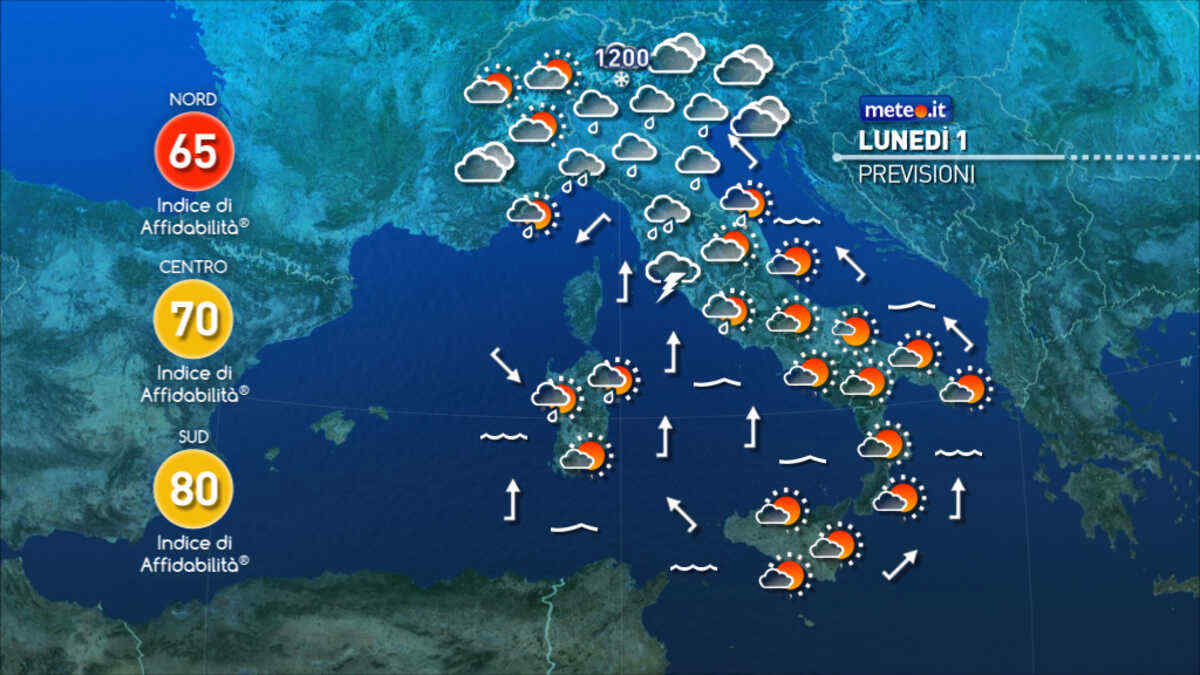 Nella notte e al mattino cielo coperto con piogge sparse in Liguria, Lombardia, Veneto, Emilia e Toscana; possibili rovesci più intensi in Liguria e temporali sulle coste toscane; deboli nevicate su Alpi e Prealpi lombarde e venete da 1.200-1.400 metri. Nel resto dell’Italia inizio di giornata con cielo parzialmente nuvoloso o nuvoloso; deboli piogge possibili anche su Lazio e nord Sardegna. Nel pomeriggio deboli piogge insistono al Nord, tranne in Piemonte e nel Ponente Ligure; nuvole in aumento e piogge isolate su Marche, Umbria e regioni centrali tirreniche, con rischio di forti rovesci o temporali sulle coste toscane, in serata nel Lazio.
