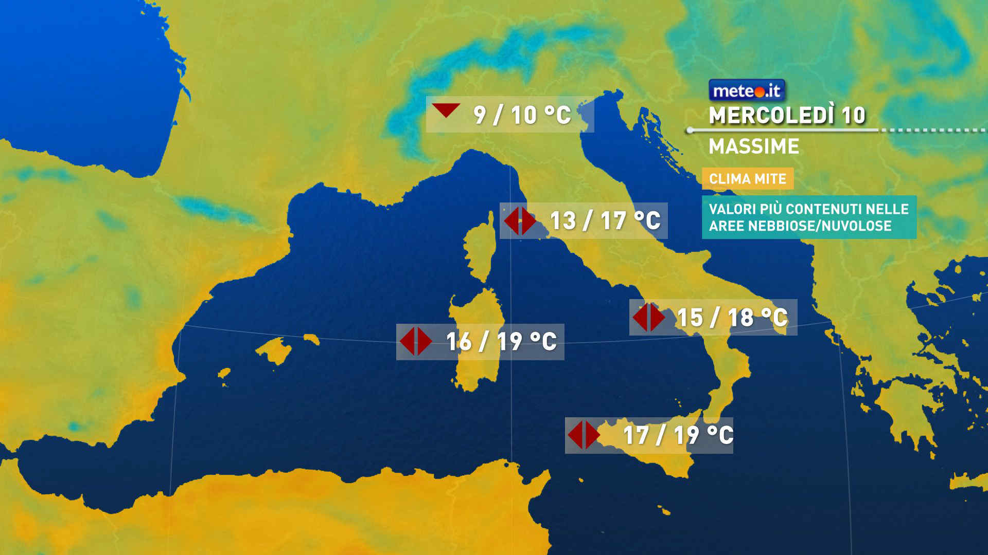 Mercoledì cielo piuttosto grigio, a causa di nebbie insistenti e nubi basse, su pianure e coste del Nord, Liguria, Toscana e Umbria; qualche pioviggine sulla Liguria. Nel resto d’Italia prevalenza di cielo sereno o poco nuvoloso, con qualche temporaneo e innocuo annuvolamento solo in Puglia, Sicilia e Sardegna. Venti in prevalenza di debole intensità. Temperature minime in crescita, con poche deboli gelate più che altro al Nord; massime con poche variazioni e in generale al di sopra delle medie stagionali, specie al Centro-Nord.