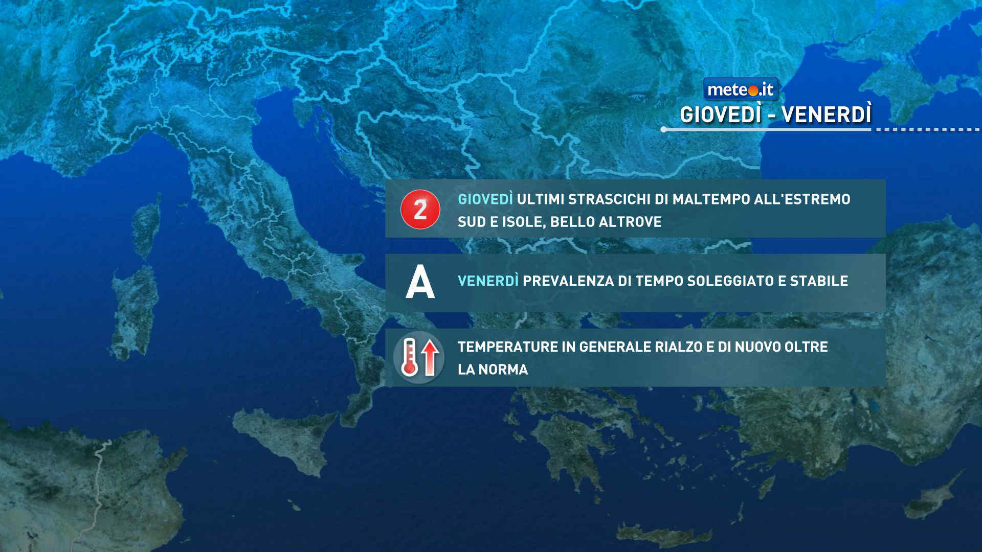 Giovedì prevalenza di tempo soleggiato al Nordovest. Alternanza tra sole e nuvole nel resto d’Italia: isolati rovesci e temporali, soprattutto al pomeriggio, su Alpi Orientali, zone interne del Centro, Campania, Appennino Lucano, Calabria, Sicilia e sud della Sardegna. Temperature massime quasi dappertutto in aumento, al di sopra della norma soprattutto al Centro-Nord. Venti moderati dai quadranti settentrionali al Centro-Sud e Isole, deboli al Nord.