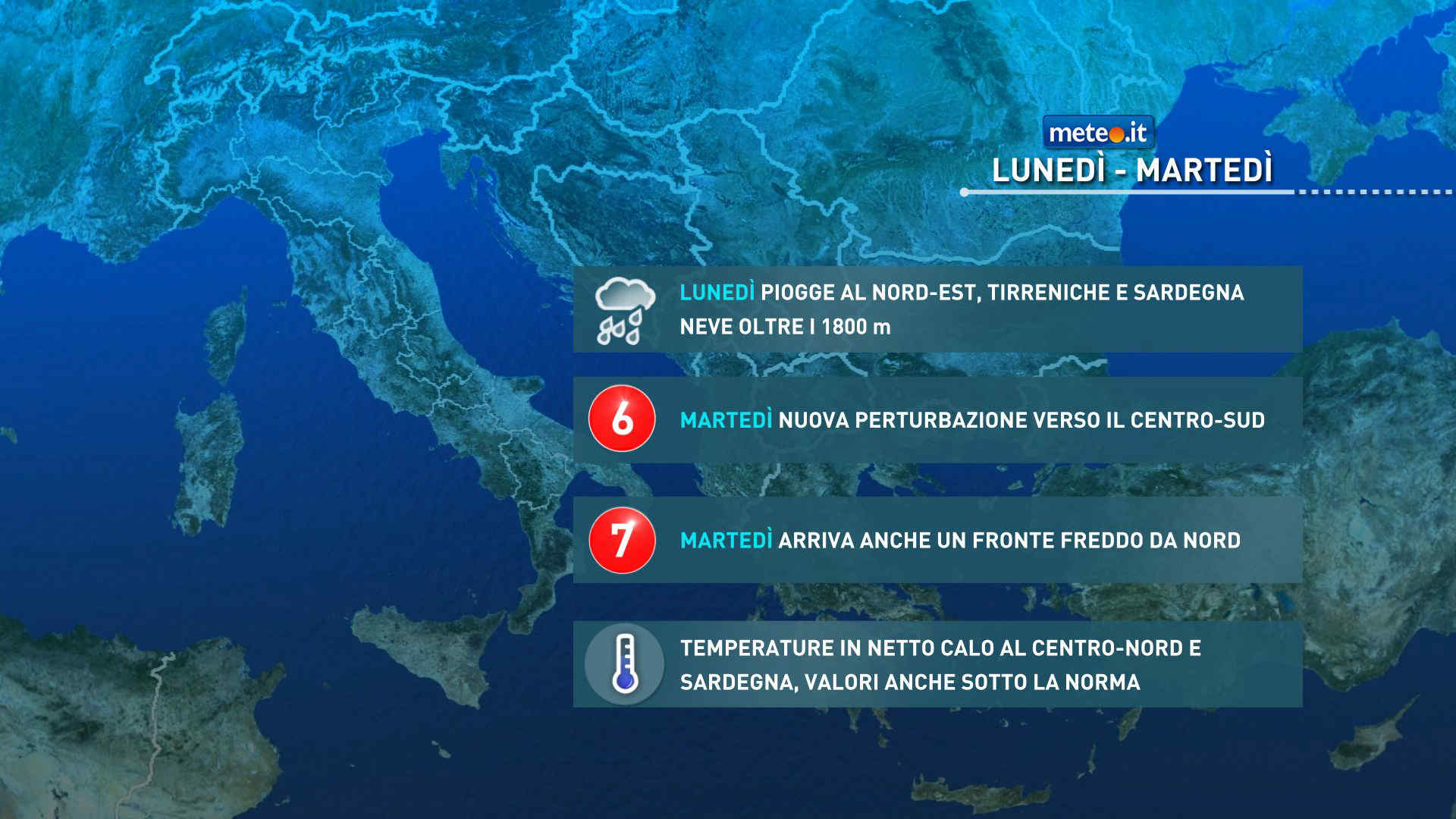 Fra sera e notte tempo in peggioramento al Nord-Est, bassa Lombardia, Levante ligure e gran parte del Centro-Sud eccetto gli estremi settori meridionali; quota neve in discesa fino a 1000-1200 metri sulle Alpi orientali. Temperature massime in calo nei settori tirrenici e in Sardegna, in rialzo al Nord; locali rialzi anche nel versante adriatico e ionico dove saranno ancora decisamente miti. Ventoso quasi ovunque per Libeccio.