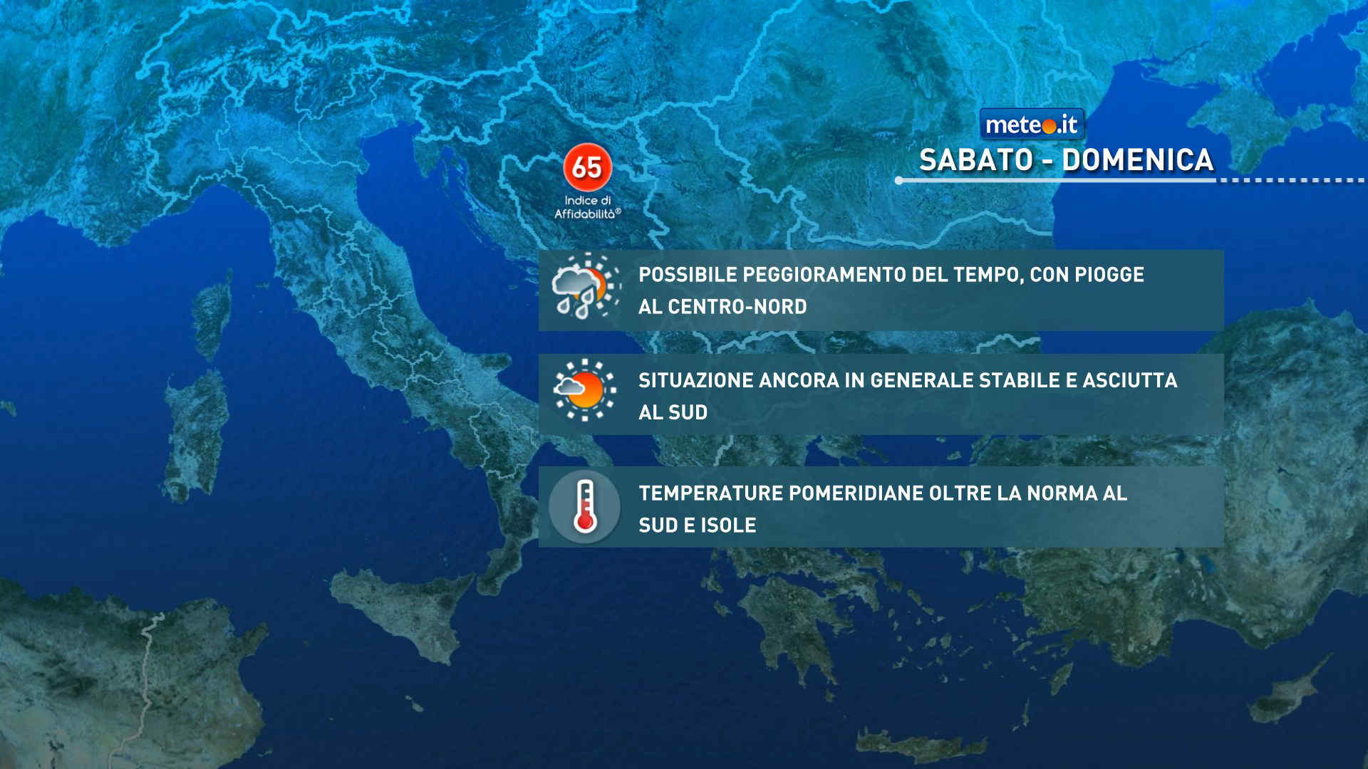 Sabato una prima perturbazione (la n.4 di ottobre) attraverserà le nostre regioni centro-settentrionali portando precipitazioni al Nord e in Toscana, mentre nel resto del Paese il tempo rimarrà stabile e abbastanza soleggiato.