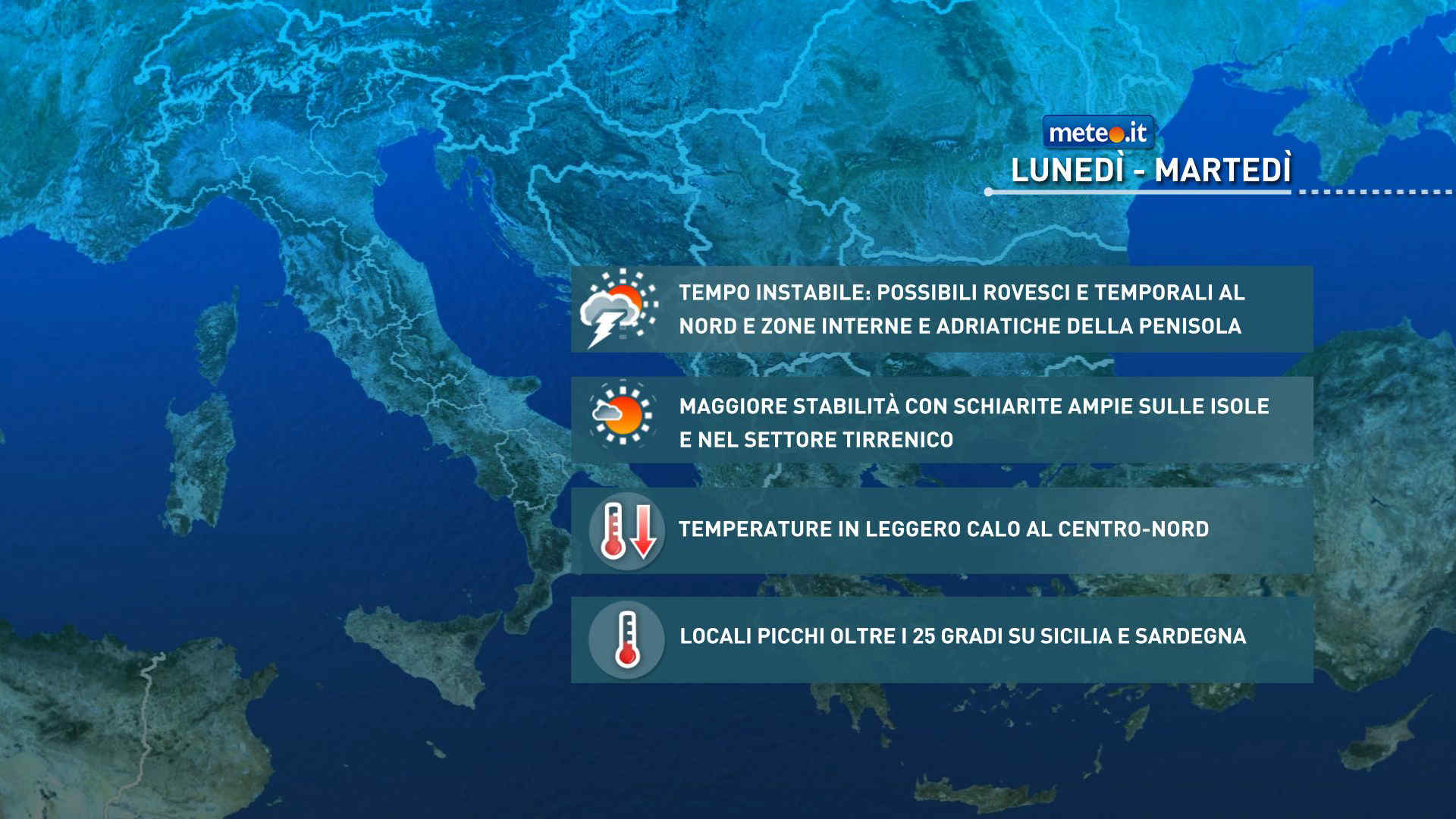 Ampie schiarite all’estremo Sud, sulle Isole, lungo le coste tirreniche e, inizialmente, anche sulle Alpi centro-occidentali. Nuvolosità variabile nel resto del Paese, con isolati rovesci o temporali nel corso della giornata su Venezie, est Lombardia, Emilia Romagna, zone interne e adriatiche del Centro. Nel pomeriggio brevi temporali possibili anche nelle zone interne del Sud e in Trentino. Alla sera probabile coinvolgimento anche del resto della Lombardia e Piemonte orientale. Temperature massime in leggero calo al Centro-Nord, in rialzo sulla Sicilia; valori per lo più compresi fra 18 e 23 gradi, con punte di 24-25 gradi nelle zone tirreniche e fino a 26-27 gradi sulle Isole. Venti in prevalenza deboli, salvo locali modesti rinforzi dai quadranti meridionali.