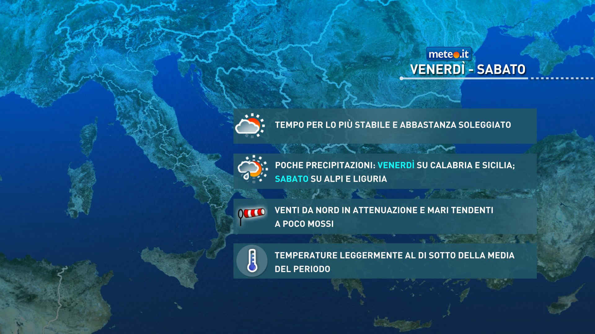 Temperature senza grandi variazioni, al più in lieve calo nelle regioni settentrionali. Venti dai quadranti settentrionali, in prevalenza deboli salvo ancora locali moderati rinforzi. Mari per lo più poco mossi.