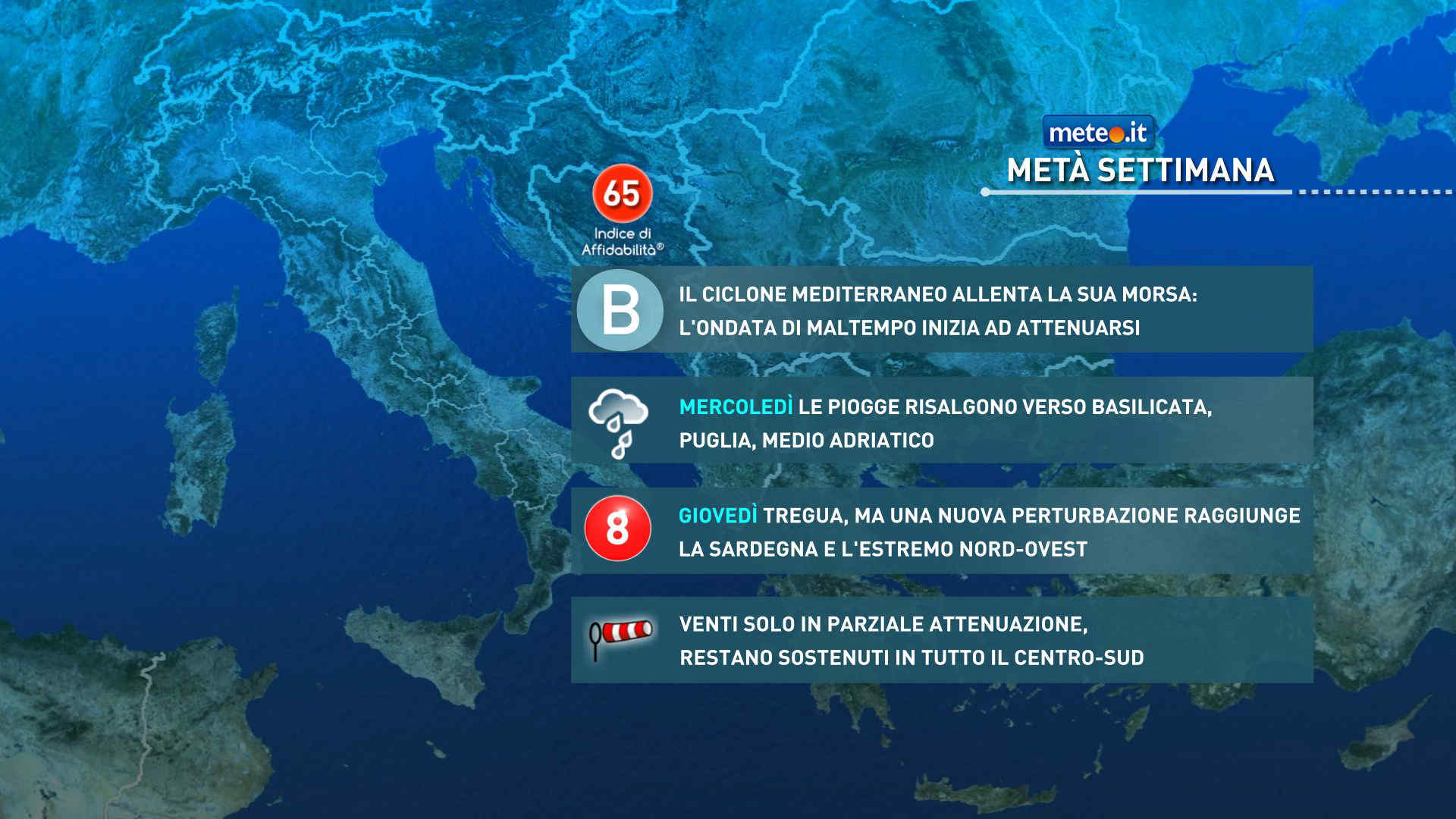 Giovedì l’area depressionaria si allontana definitivamente verso la Grecia ma alle sue spalle la circolazione sul Mediterraneo sarà ancora caratterizzata da un flusso occidentale ondulato che è destinato a indirizzare nel resto della settimana altre perturbazioni atlantiche verso il Mediterraneo e l’Italia.