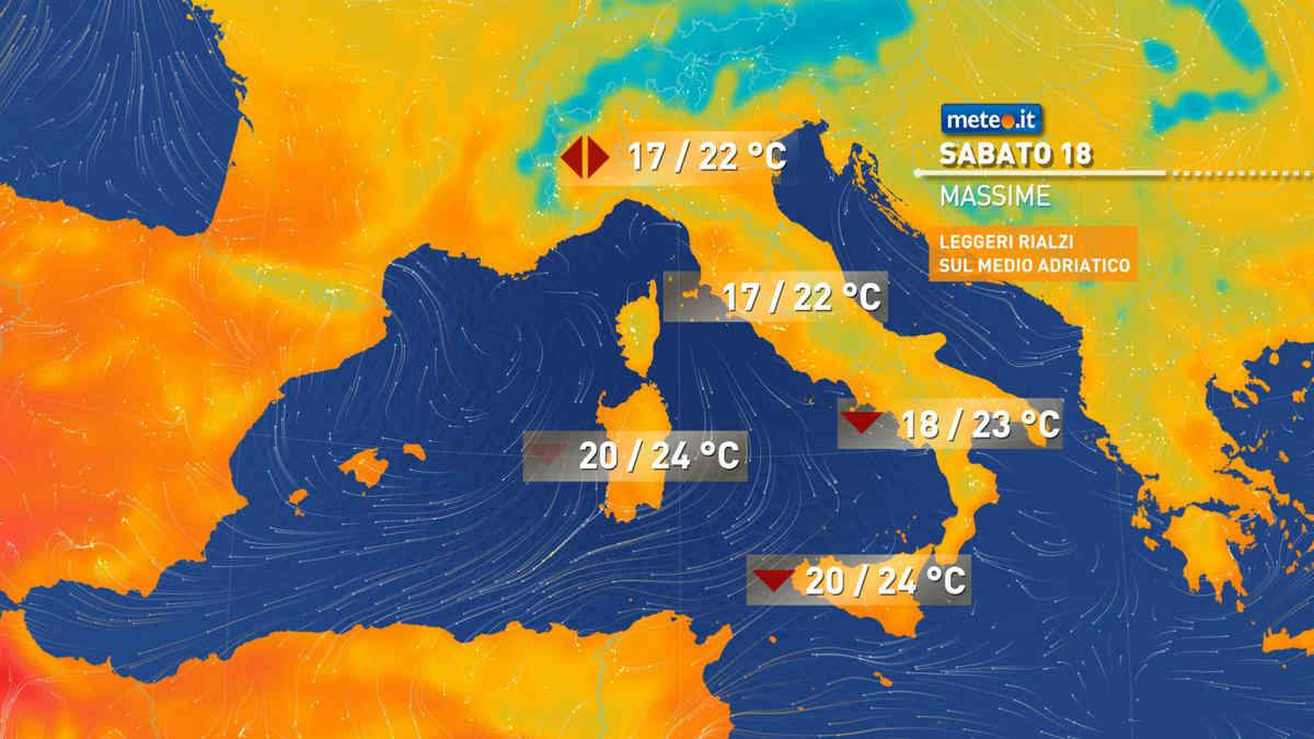Temperature massime in leggero rialzo nel settore del medio-basso Adriatico, in lieve calo sulla Sicilia ionica; valori in generale compresi fra 18 e 23 gradi, ma con qualche punta più elevata su Calabria e Isole. Venti deboli, salvo moderati rinforzi da est nei canali delle Isole e di Maestrale sul basso Adriatico.