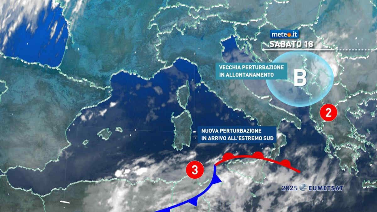 Questo fine settimana del 18-19 ottobre trascorrerà con tempo stabile al Centro-Nord e in Sardegna, a parte ancora un po’ di nuvole e residue precipitazioni sul medio Adriatico. Sulle regioni meridionali, invece, il tempo sarà più variabile: da un lato si vedranno i residui effetti della vecchia perturbazione (la n.2) in allontanamento, in termini di nuvole e qualche sporadica pioggia al Sud, dall’altro lato si avranno nuove precipitazioni in arrivo su Sicilia e Calabria a causa del transito di un’altra perturbazione (la n.3) di origine nord africana che già domenica tenderà ad allontanarsi verso la Grecia.