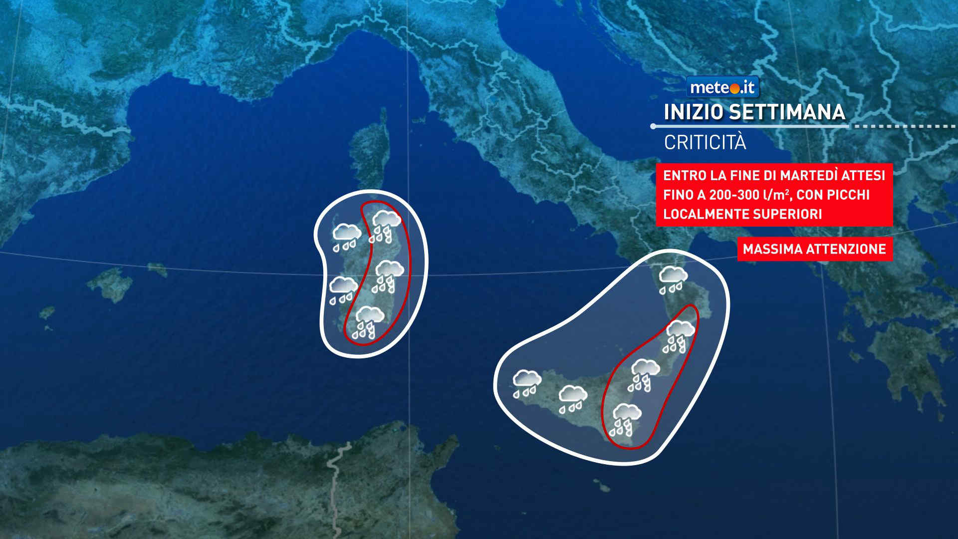Sui mari di ponente e sul mar Ionio si intensificano gradualmente i venti di Scirocco: sta per aprirsi una settimana molto complessa e difficile per l’Italia meridionale, a causa dell’avvicinamento da ovest di una pericolosa perturbazione atlantica (la numero 7 del mese), responsabile di una fase di maltempo estremo, segnata da probabili gravi e pesanti criticità a causa delle piogge in qualche caso torrenziali (attese cumulate di pioggia tra i 200 e i 400 mm entro la fine di martedì), dei venti di tempesta (con raffiche al suolo fino a 120-130 Km/h), dei mari grossi o molto grossi (con onde fino a 6-7 metri fino alle coste) e delle conseguenti violente mareggiate. A favorire una tale esaltazione dei fenomeni sarà l’approfondimento della depressione collegata a questa perturbazione e in ingresso in queste ore sul Mediterraneo occidentale: traslando verso est evolverà in un vero e proprio ciclone mediterraneo (appena ribattezzato “Harry” dall'AEMET spagnola), il cui centro si muoverà lentamente tra le coste algerine, il canale di Sardegna e il canale di Sicilia, per spostarsi definitivamente verso lo Ionio e indebolirsi non prima della giornata di giovedì. La situazione, molto critica, resta sotto osservazione e da monitorare in base ai prossimi aggiornamenti dei modelli fisico-matematici, ma impone anche la massima attenzione verso le allerte emesse nelle prossime 24-48 ore dalla Protezione Civile nazionale e da quelle regionali direttamente coinvolte.