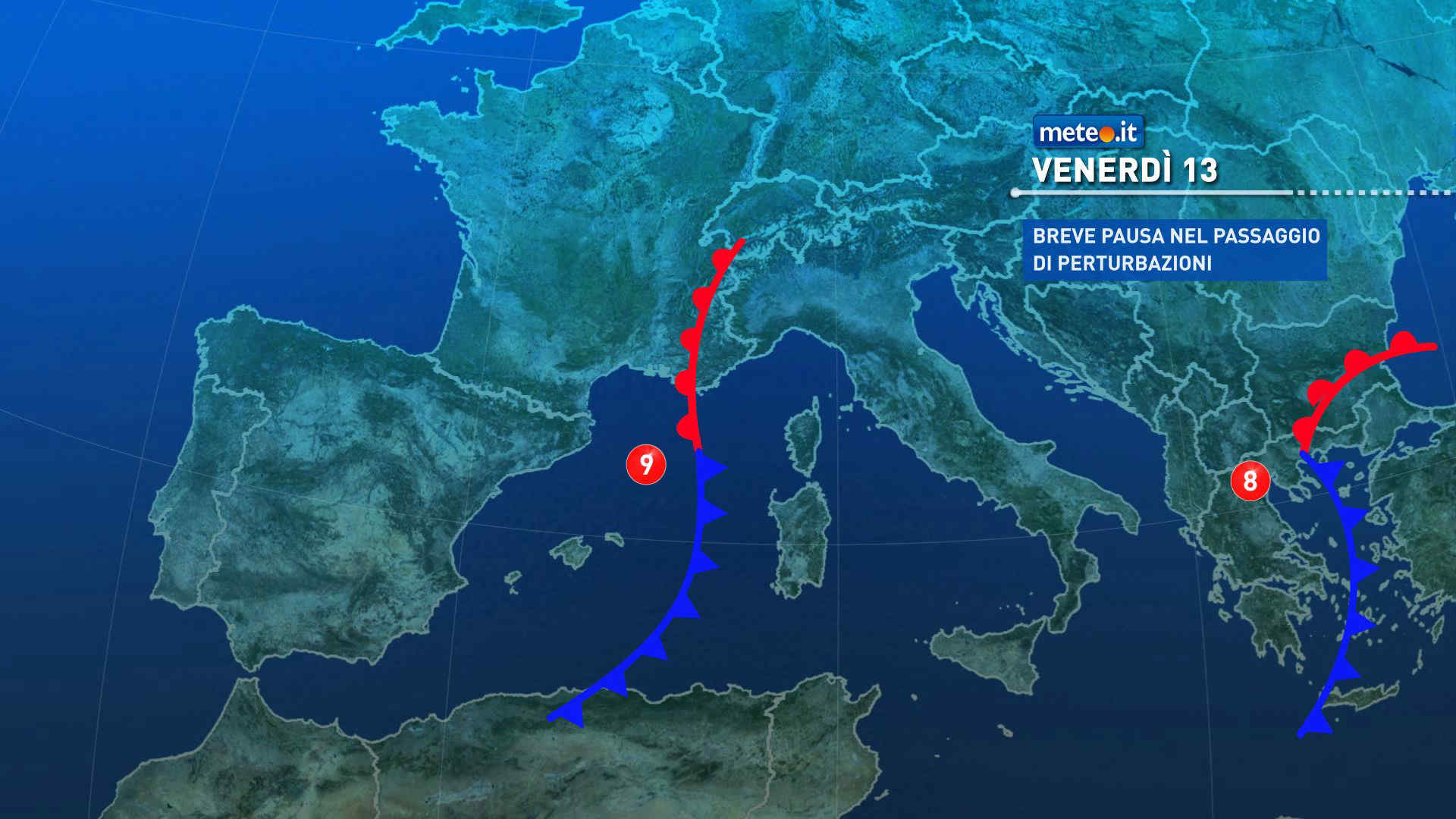 Venerdì 13 febbraio in giornata si conferma una breve tregua, con le ultime precipitazioni nella notte e al mattino sulla Puglia centro-meridionale, la Calabria tirrenica e la Sicilia nord-orientale, in successivo esaurimento. Nel resto del Paese cielo inizialmente sereno o poco nuvoloso, con tendenza ad aumento della nuvolosità un po’ ovunque entro la serata. Prime piogge dal pomeriggio sulla Sardegna, in estensione a fine giornata a gran parte del Centro-Nord.
