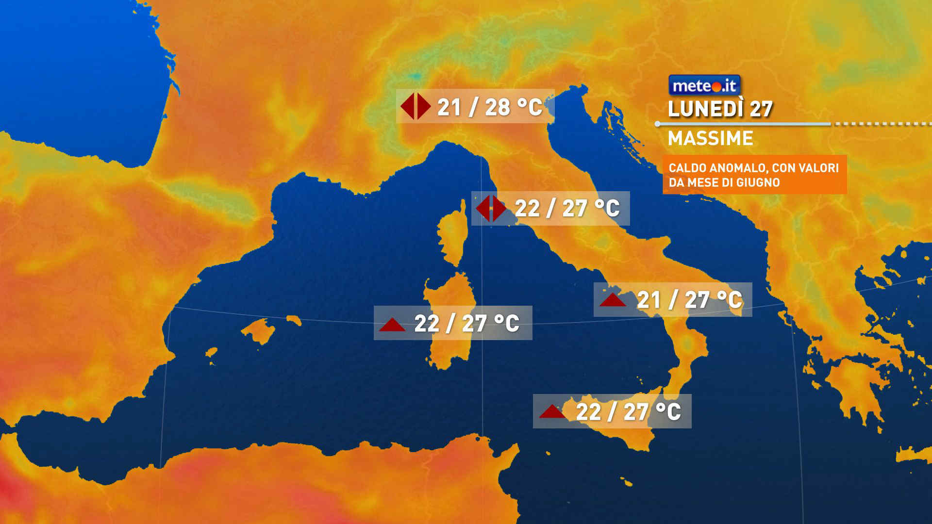 Temperature massime in leggera flessione nelle aree più instabili del Nord. Valori generalmente compresi tra 21 e 26 gradi, con punte superiori nelle aree interne peninsulari e sulle Isole maggiori. Venti di Scirocco in moderato rinforzo intorno alla Sardegna e nel canale di Sicilia.