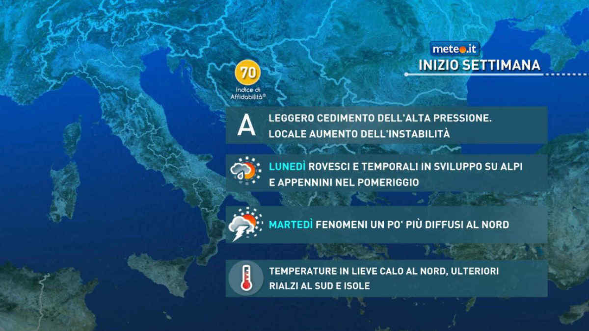 Lunedì al mattino cielo in prevalenza sereno o poco nuvoloso, con qualche nuvola innocua in più solo su Alpi Occidentali e Ponente Ligure. Nel pomeriggio temporaneo aumento della nuvolosità, con isolati rovesci e temporali, su Alpi e zone appenniniche. Temperature massime in leggera diminuzione al Nord, pressochè invariate al Centro-Sud e Isole: valori sempre al di sopra delle medie stagionali praticamente in tutta Italia.
