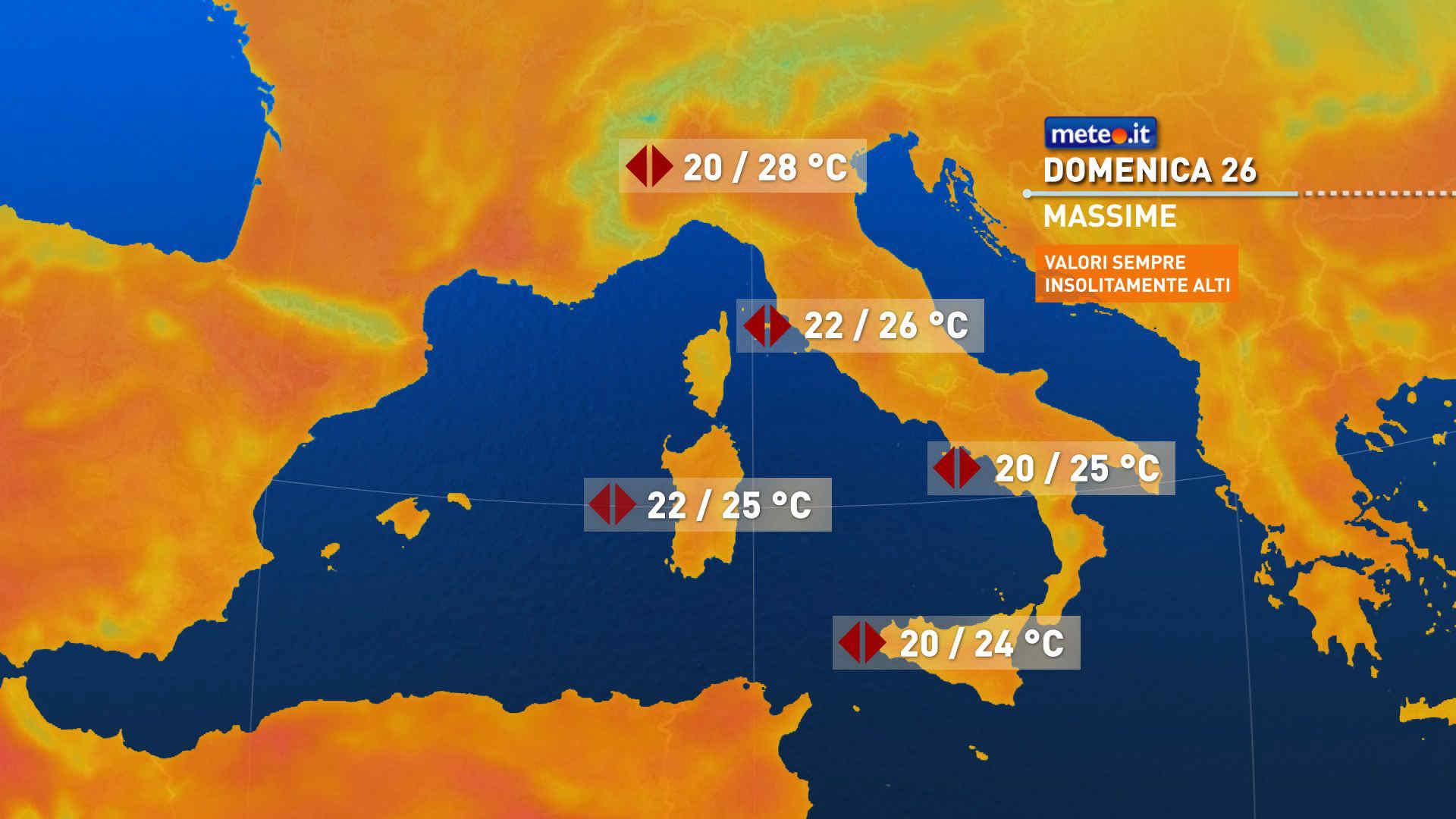 Domenica al mattino un po’ di nuvole comunque innocue, su Liguria e Alta Toscana; prevalenza di tempo soleggiato altrove. Nel pomeriggio temporaneo aumento della nuvolosità sui rilievi del Nord, con isolati temporali sulle Alpi Occidentali; prevalenza di cielo sereno o poco nuvoloso sul resto d’Italia. Temperature massime in generale stazionarie o in ulteriore leggero aumento, quasi dappertutto comprese fra 20 e 26 gradi, con punte anche di 27-28 gradi al Nord e regioni centrali tirreniche. Venti in generale di debole intensità.
