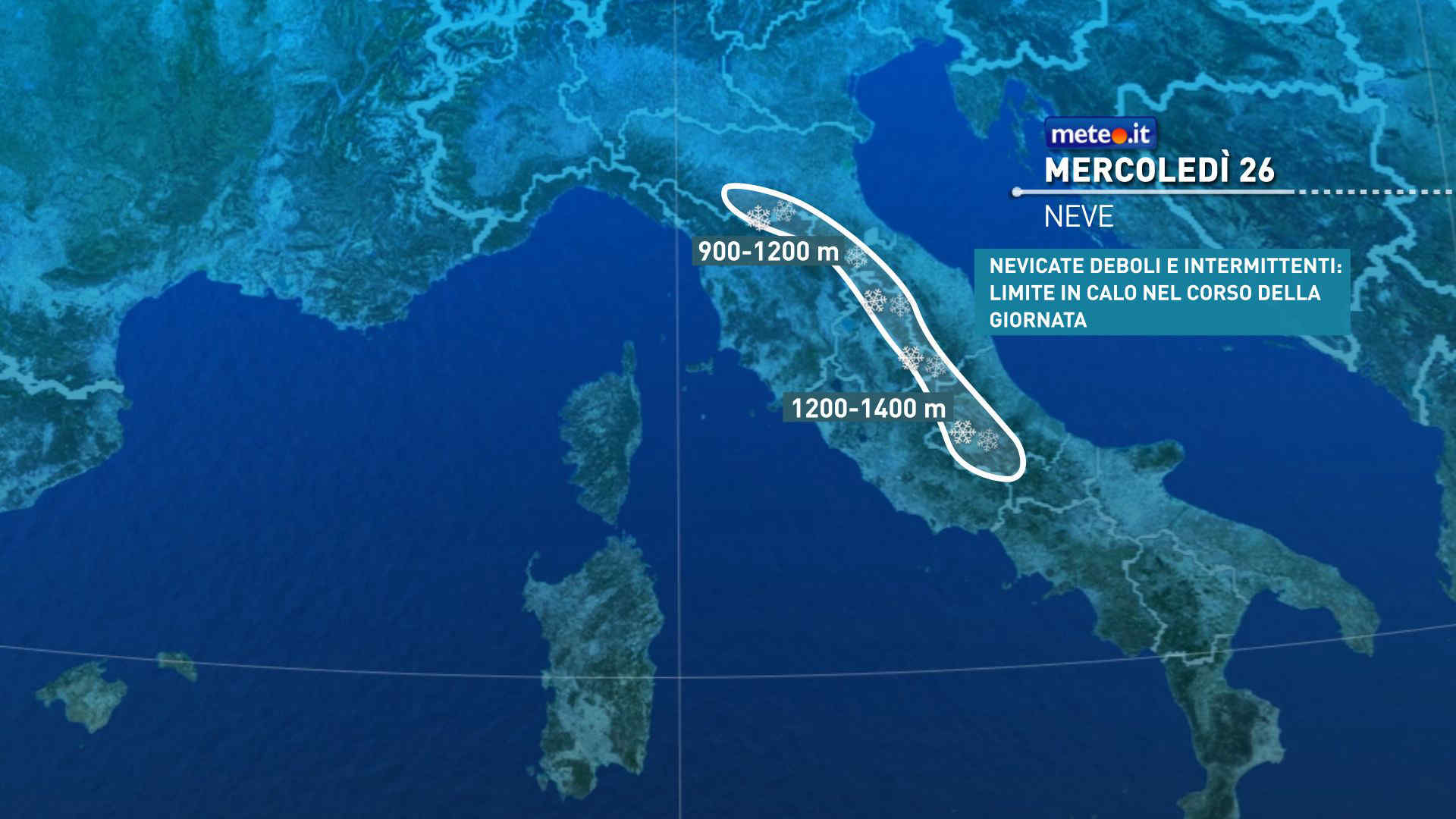Precipitazioni sparse e intermittenti, anche sotto forma di rovesci o temporali, più probabili su regioni centrali, Sardegna e Campania, da metà giornata anche su Romagna, Calabria tirrenica e Sicilia centro-occidentale. Al Centro e sui rilievi romagnoli quota neve in calo a 900-1200 metri.