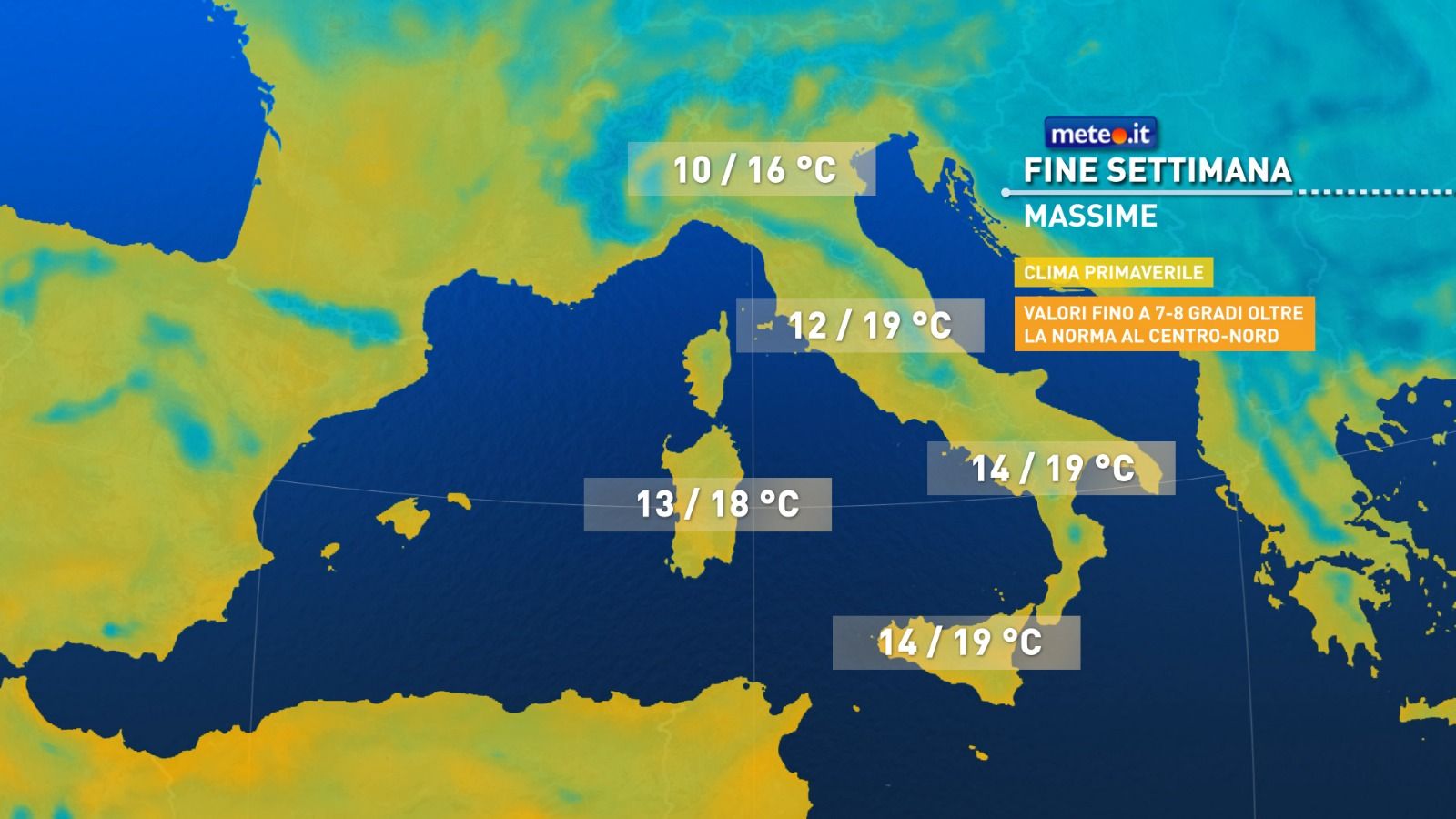 Temperature minime in generale diminuzione, all’alba deboli gelate al Nord; massime in rialzo al Centro-Nord. Venti moderati o tesi settentrionali in Adriatico e al Sud; orientali sulle Isole.
