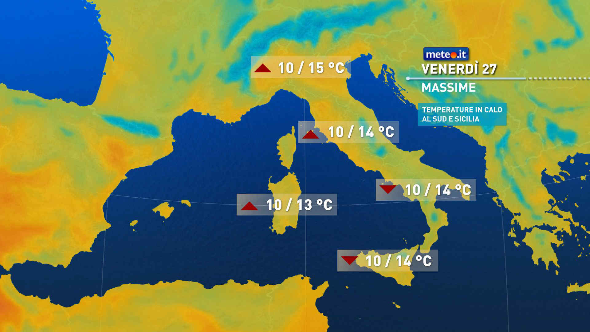 Al mattino saranno ancora probabili precipitazioni deboli diffuse su Marche, Abruzzo e Molise; limite delle nevicate in rialzo a 800-900 m; rovesci sparsi in Puglia, sul nord della Sicilia e sulla Calabria tirrenica meridionale. Nel corso del giorno i fenomeni sulle regioni centrali adriatiche tenderanno a cessare; ancora rovesci isolati in Puglia, sulla Calabria ionica e sul nord della Sicilia. Ampi rasserenamenti al Nord, su Toscana e Sardegna. Temperature minime ancora vicine allo zero anche in Pianura al Nord; massime in aumento delle regioni centro settentrionali. Venti: tesi settentrionali sul mare Adriatico centrale, sul medio e basso Tirreno, fino a forti di maestrale nel canale di Sicilia. Mari molto agitati.
