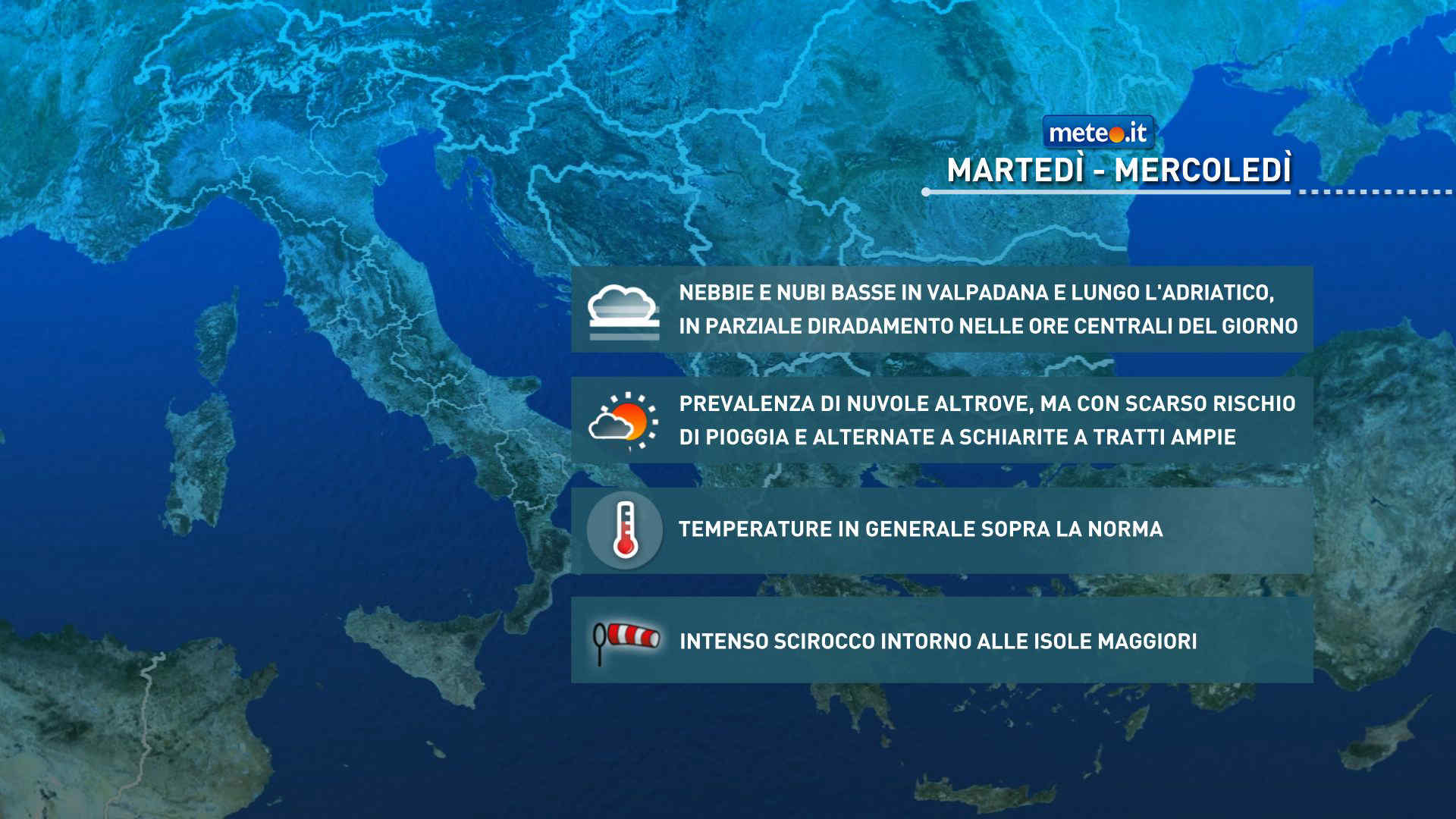 Temperature massime stazionarie o in leggero rialzo, con valori ancora sopra la media in quasi tutto il Paese. Scirocco in sensibile rinforzo in Sardegna.