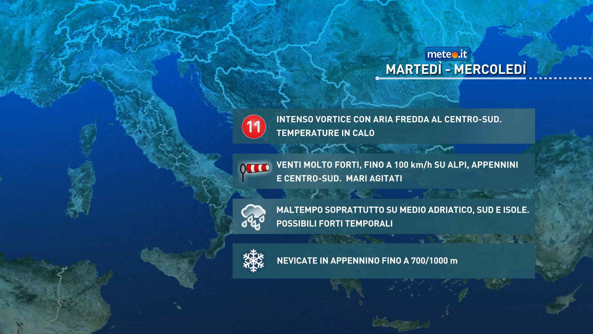 Maltempo su regioni centrali adriatiche, Sud e Sicilia, con piogge e temporali anche forti; quota neve in Appenino intorno a 800/1200 metri, in rialzo a fine giornata. Nubi meno compatte e piogge generalmente deboli e intermittenti su bassa Toscana, Umbria, Lazio e Sardegna nordorientale. Al Nord nuvolosità irregolare, con più schiarite al mattino al Nord-Ovest e nubi in aumento tra pomeriggio e sera.
