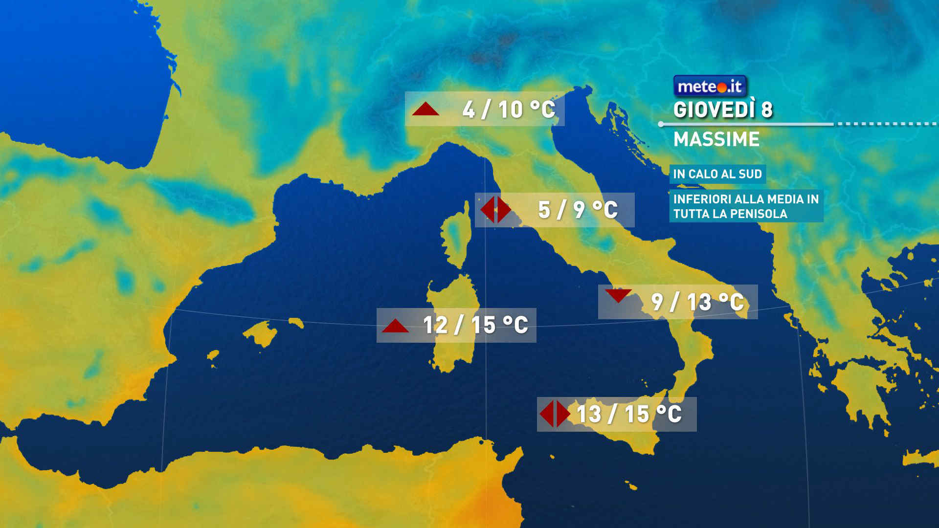 Cielo sereno o poco nuvoloso al Centro-Nord e in Campania, a parte la presenza di nubi compatte e nevicate fino a bassa quota sulle Alpi occidentali. Nuvoloso nel resto del Paese, con piogge e rovesci isolati e intermittenti su Puglia, Calabria e settori nord delle Isole, in attenuazione sulla Puglia dal pomeriggio e nelle altre regioni alla sera. Nevicate a quote collinari nel Gargano, oltre 800-1000 metri su Calabria e Sicilia. Temperature minime in calo al Nord-Est e al Centro-Sud: gelate diffuse al Centro-Nord. Massime in rialzo in Sardegna e, localmente, anche al Centro-Nord, in calo al Sud e in Sicilia: valori quasi ovunque sotto la media. Ventoso per Maestrale al Sud, sulle Isole e localmente anche al Centro. Mari da mossi a localmente agitati, eccetto i settori nord del Tirreno e Adriatico.