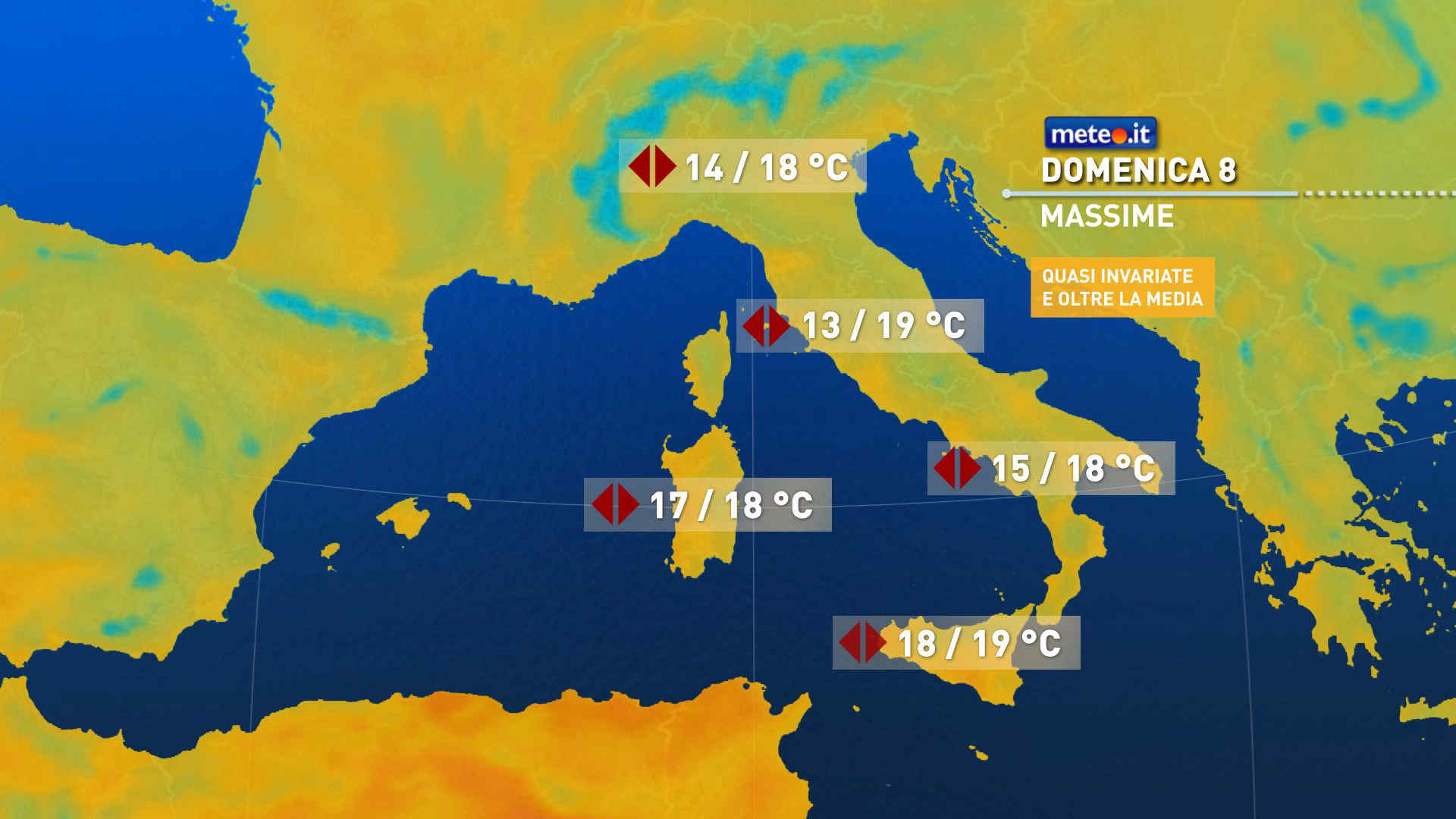 Tempo soleggiato al Nord, tranne in Liguria e basso Piemonte, con qualche pioggia possibile nel Ponente ligure, e iniziale presenza di banchi di nebbia su Valpadana orientale e coste dell’alto Adriatico, in graduale diradamento. Prevalenza di nuvole al Centro-Sud, con piogge e locali temporali in Molise, Puglia, nelle zone interne e tirreniche della penisola, nel settore ionico, sui rilievi della Sicilia e nel centro-nord della Sardegna, più diffuse nel pomeriggio e in parziale attenuazione alla sera. Temperature massime stazionarie o in lieve calo, con valori ancora nella media o leggermente sopra. Venti deboli, con locali rinforzi intorno alle Isole dove i mari restano mossi.