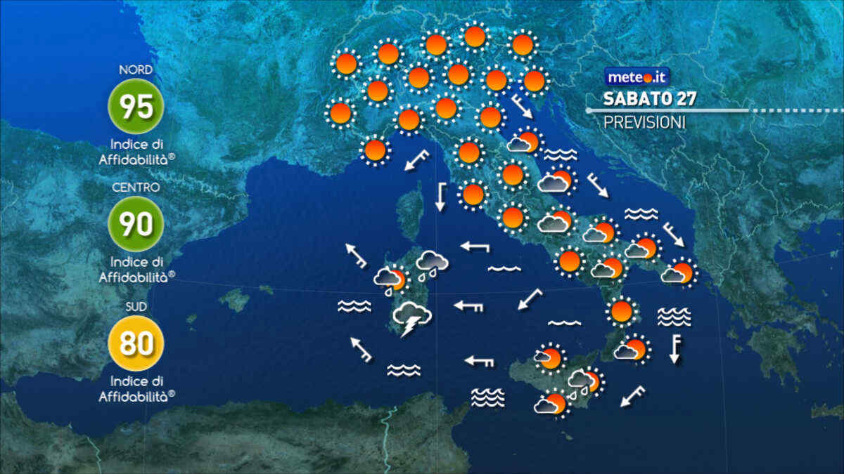 Tempo stabile e ben soleggiato al Nord e in gran parte del Centro-Sud, a parte ancora della nuvolosità sparsa su Marche, Abruzzo, Molise, Appennino campano (Irpinia), Basilicata, Puglia e nordest della Calabria ma in graduale e parziale attenuazione in giornata. Il maltempo insiste in Sardegna con molte nuvole accompagnate da piogge e rovesci sparsi, più insistenti e diffusi sul versante orientale dove saranno anche possibili dei temporali. In Sicilia schiarite più ampie nel nord e ovest dell'Isola, locali piogge nel sudest.