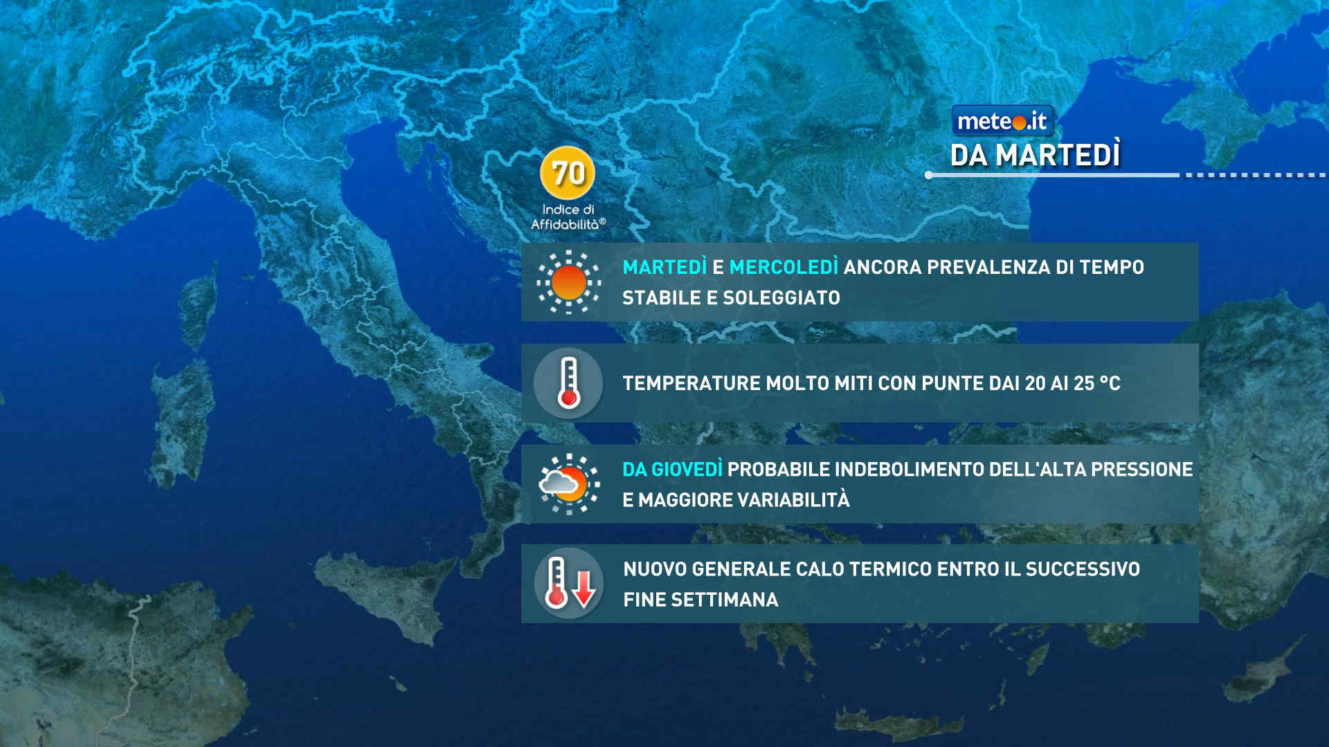Giovedì 9 ancora pochi cambiamenti di rilievo con un’altra giornata prevalentemente soleggiata. Un po’ più di nuvole potrebbero transitare al Nordest e in giornata potrà svilupparsi della nuvolosità cumuliforme lungo l’Appennino. Venti più freschi potrebbero affacciarsi sull’Adriatico con un primo raffreddamento nel settore dal Triveneto alla Puglia. Venerdì 10 poi una perturbazione potrebbe transitare rapidamente con alcune precipitazioni al Nordest, in Emilia Romagna e tra le zone interne e adriatiche della penisola. Per conferme e maggiori dettagli si rimanda agli aggiornamenti dei prossimi giorni.