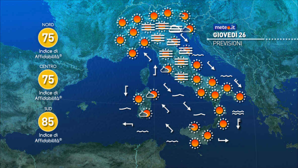 Inizio di giornata con cieli grigi e nebbiosi nelle zone di pianura e costiere del Nord, nelle valli del Centro, sul medio Adriatico e sui litorali tirrenici fino alla Campania.