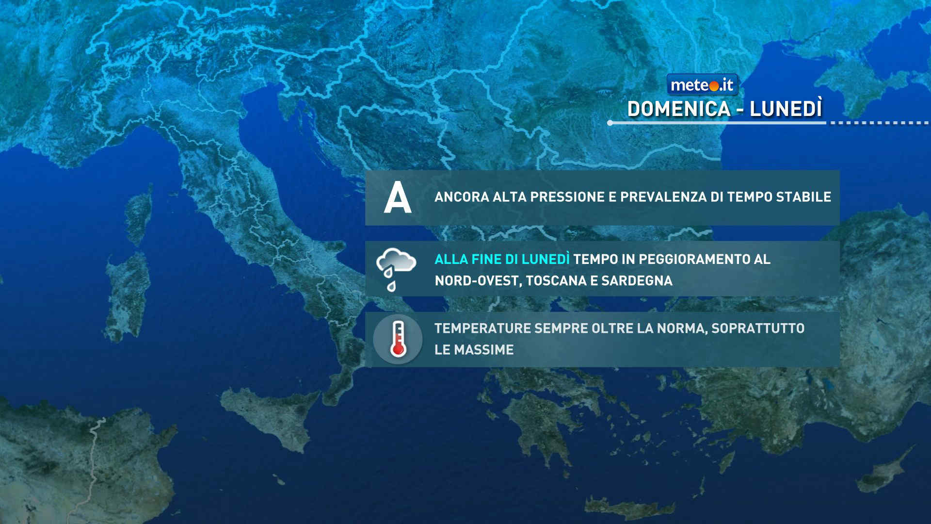 La situazione cambierà con la nuova settimana, perché già lunedì l’alta pressione comincerà a indebolirsi e alla fine del giorno arriverà da ovest una perturbazione (la numero 4 del mese), con le prime piogge al Nord-Ovest e in Sardegna. Questa nuova perturbazione martedì porterà maltempo diffuso su gran parte d’Italia, con piogge localmente intense e nevicate anche abbondanti sulle Alpi, e mercoledì maltempo residuo soprattutto al Nord e regioni tirreniche. Nei prossimi giorni le temperature diurne saranno ancora diffusamente oltre la norma al Centro-Sud, mentre al Nord è atteso un graduale calo termico, con valori più vicini alla media agli inizi della nuova settimana.