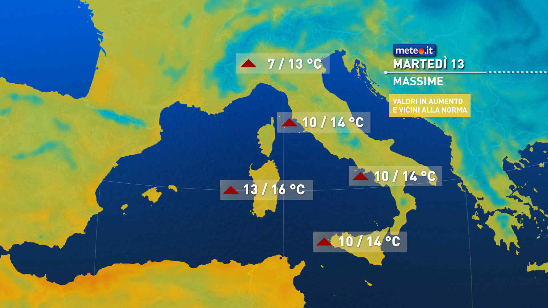 Le temperature risulteranno stazionarie o in ulteriore rialzo, con minime per lo più sopra lo zero alle basse quote e valori massimi fino a 14–17 gradi al Centro-Sud. Venti meridionali, fino a moderati sui mari occidentali.