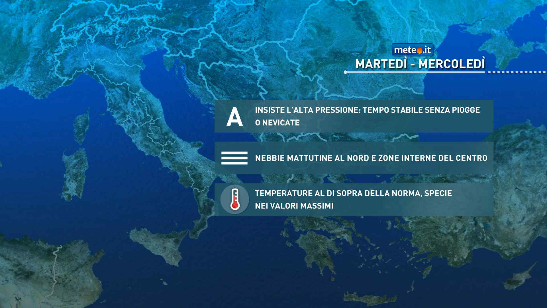 L’alta pressione, che oramai occupa tutta l’Italia, insisterà almeno fino a venerdì 27, garantendo così prevalenza di tempo stabile e asciutto in tutte le nostre regioni, sebbene con il fastidio di nebbie anche fitte, nelle ore notturne e del primo mattino, al Nord e sulle zone interne del Centro. Grazie all’alta pressione si registrerà anche un ulteriore aumento delle temperature, che si spingeranno ben oltre le medie stagionali, specie nei valori massimi.