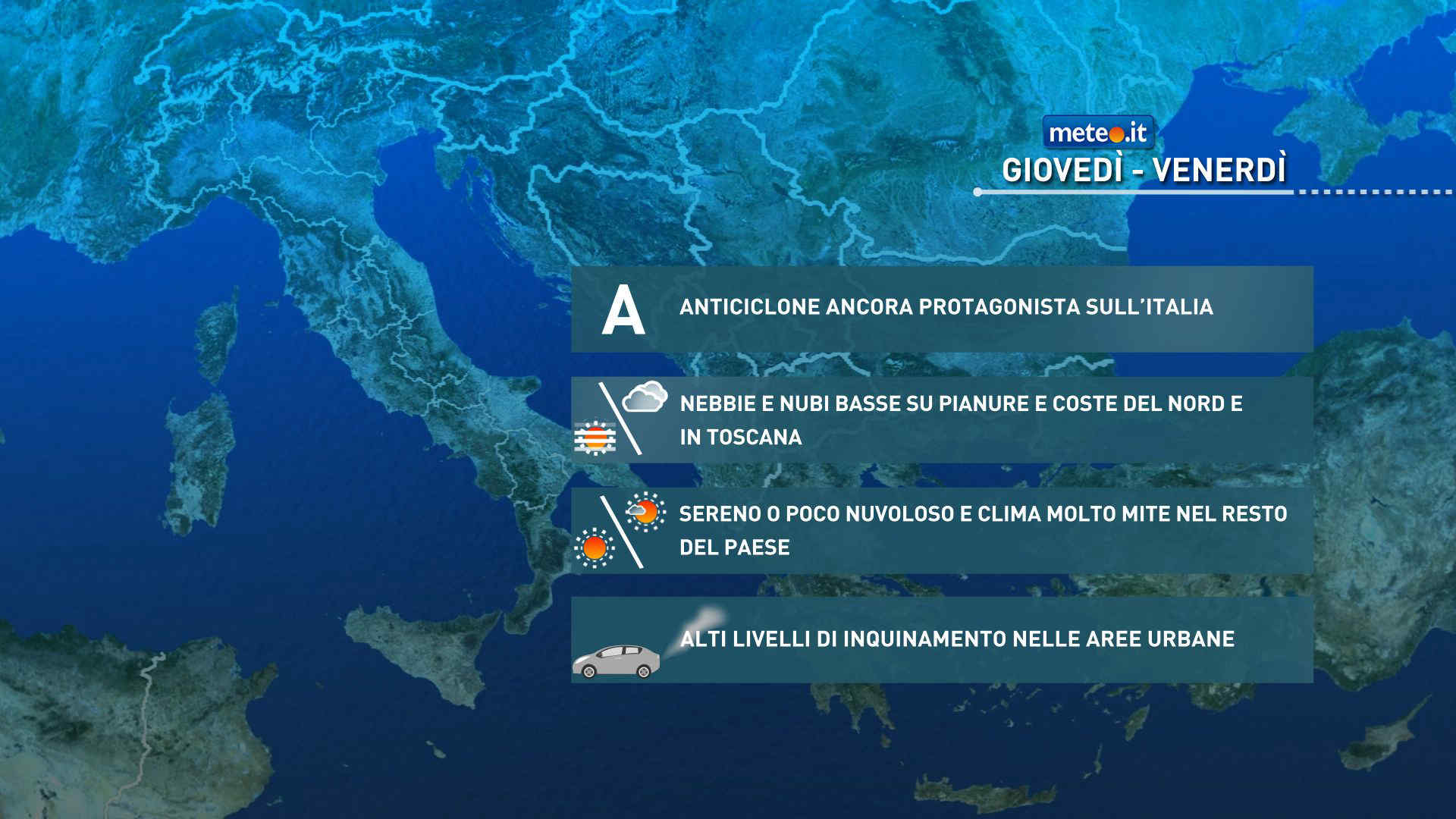 L’alta pressione continuerà a dettare le condizioni meteo sull’Italia molto probabilmente fino a lunedì 15 e non sono previsti quindi cambiamenti di rilievo: il tempo si manterrà stabile, senza precipitazioni significative, e si prolungherà l’anomalia termica a causa della massa d’aria molto mite associata all’anticiclone. La stabilità atmosferica crea condizioni favorevoli al ristagno di umidità ed inquinanti nei bassi strati e con l’assenza di ventilazione la qualità dell’aria non potrà che peggiorare, soprattutto nelle aree urbane della pianura padana. Nebbie e nuvolosità bassa saranno in molti casi persistenti, ma li ritroveremo più diffusi e densi soprattutto nelle ore notturne e al mattino.