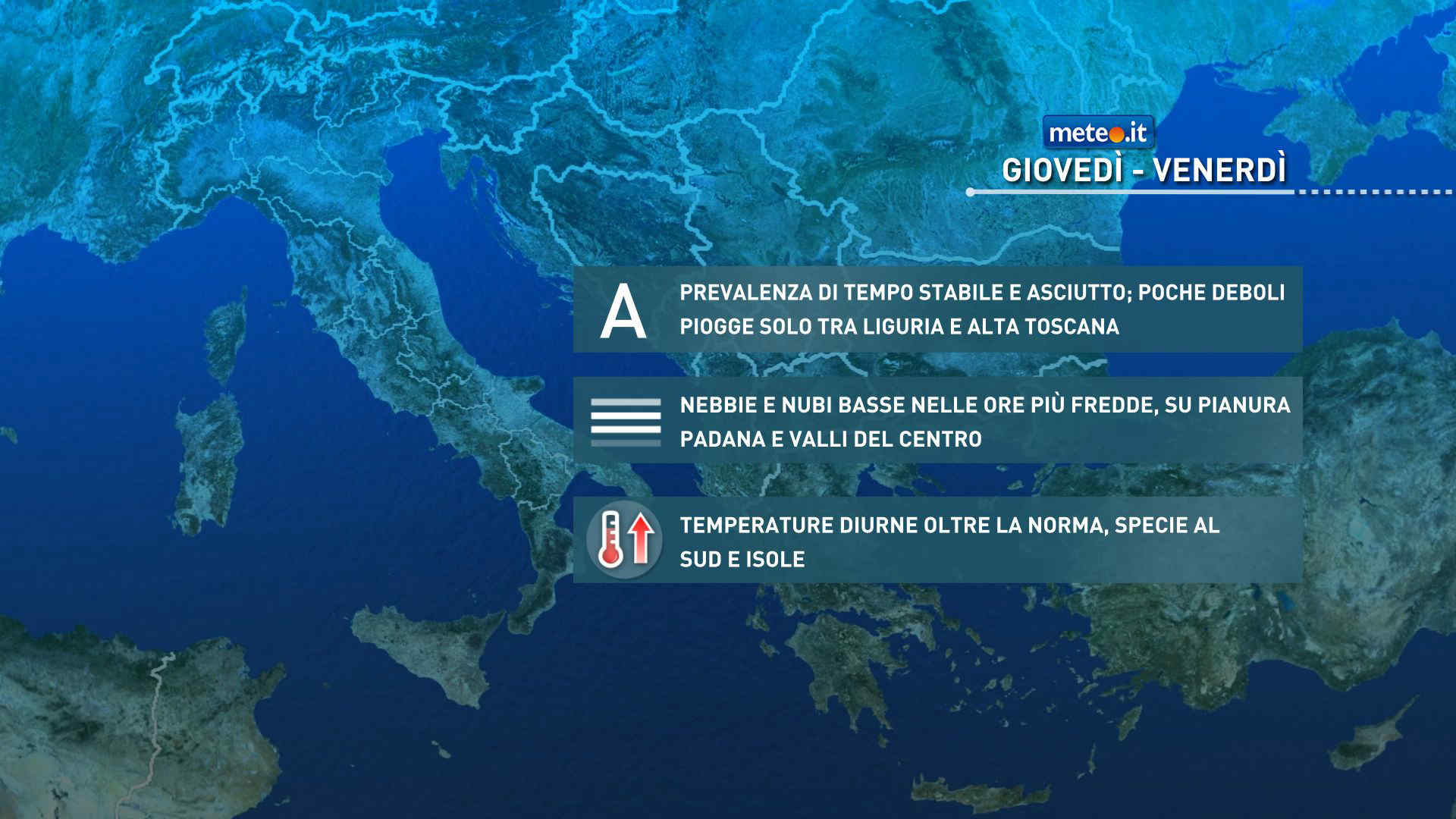 Fino a venerdì l’alta pressione di matrice sub-tropicale rimarrà stabilmente posizionata sull’Italia, garantendo prevalenza di tempo stabile e in prevalenza soleggiato, ma favorendo anche la formazione di nebbie e nubi basse nelle ore più fredde. Le temperature massime si manterranno su valori oltre la norma, con una sensibile escursione termica nelle regioni settentrionali.