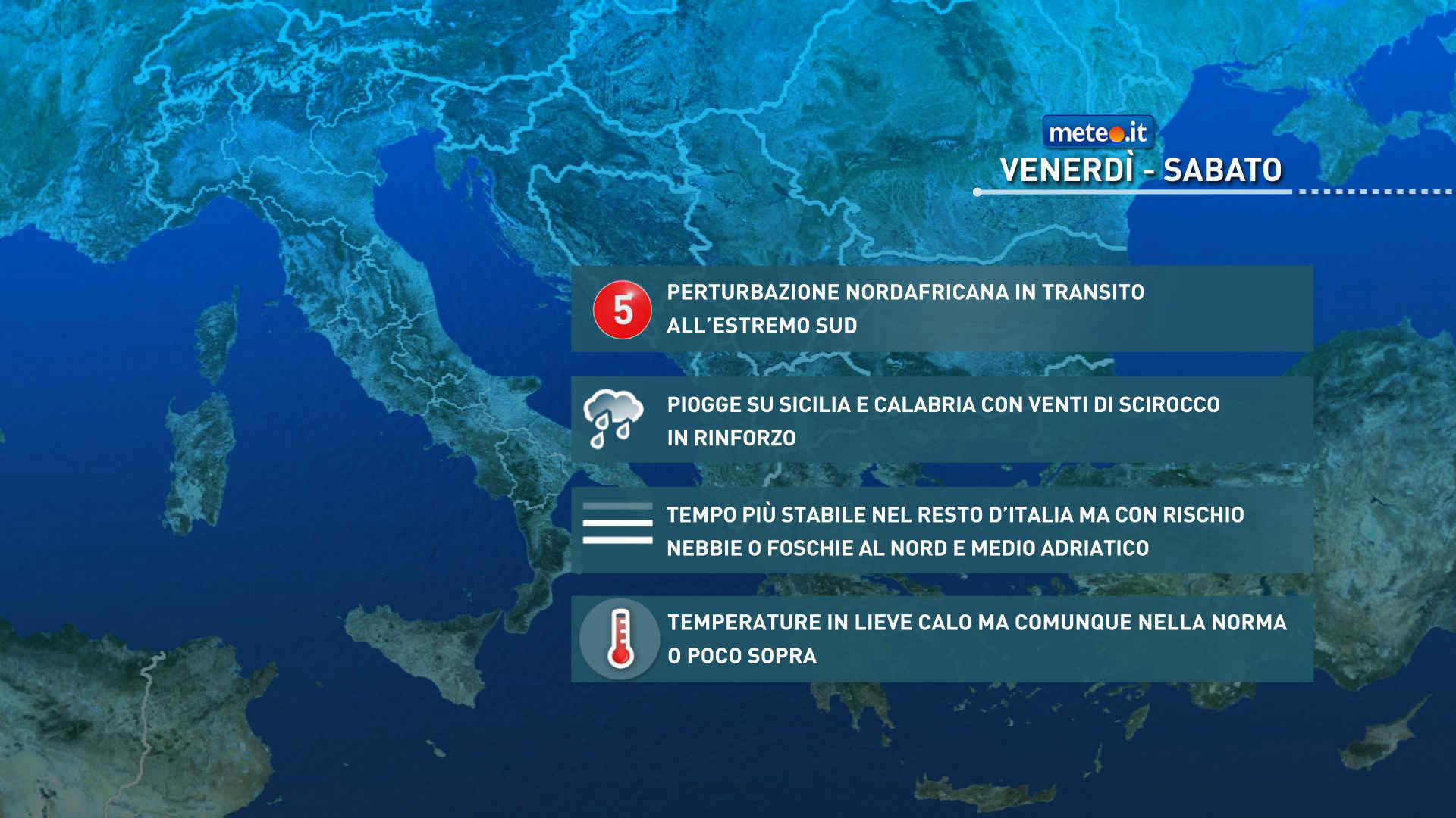 Nel pomeriggio i rasserenamenti si estendono all’arco alpino e alle vicine pianure, all’Abruzzo e al Molise. Peggiora con piogge sparse in Sicilia, e di sera anche nella bassa Calabria. Temperature massime in calo in Sicilia. Insiste lo Scirocco da moderato a forte sulle isole maggiori e mari circostanti.