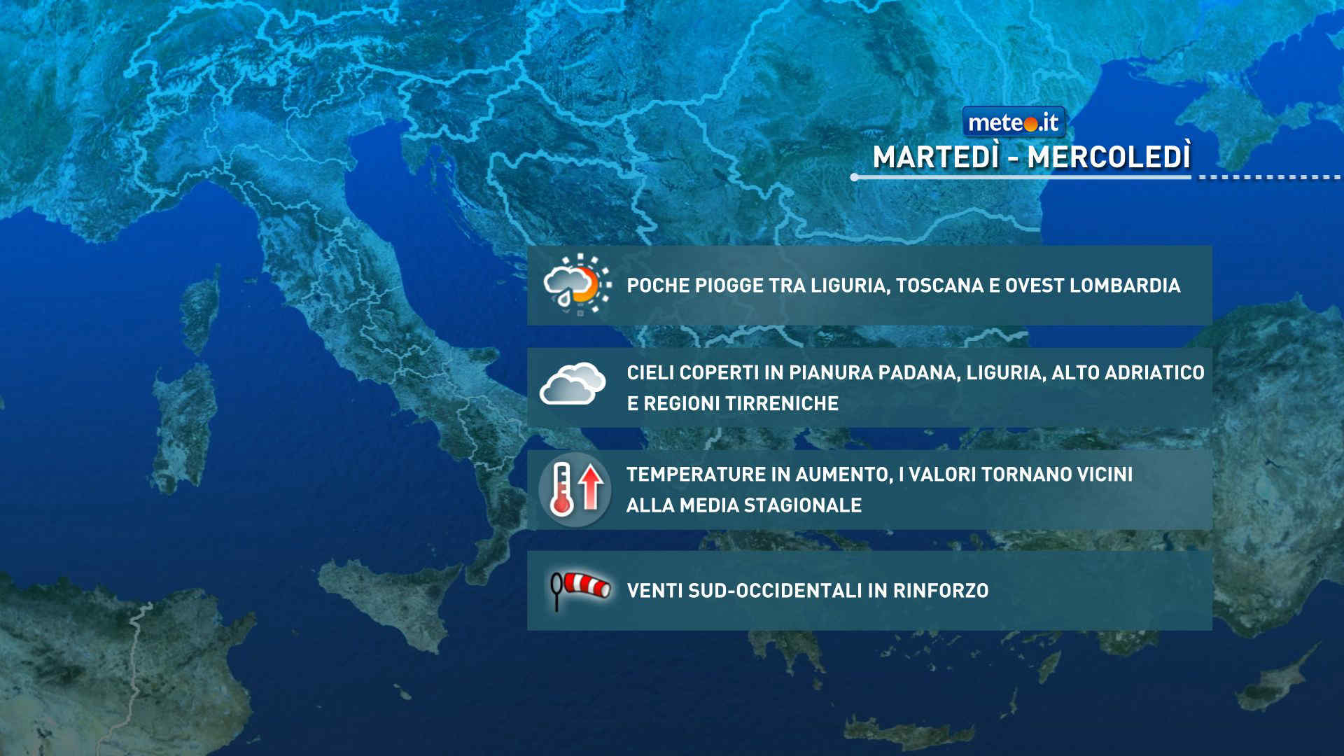 Le temperature risulteranno stazionarie o in ulteriore rialzo, con minime per lo più sopra lo zero alle basse quote e valori massimi fino a 14–17 gradi al Centro-Sud. Venti meridionali, fino a moderati sui mari occidentali.
