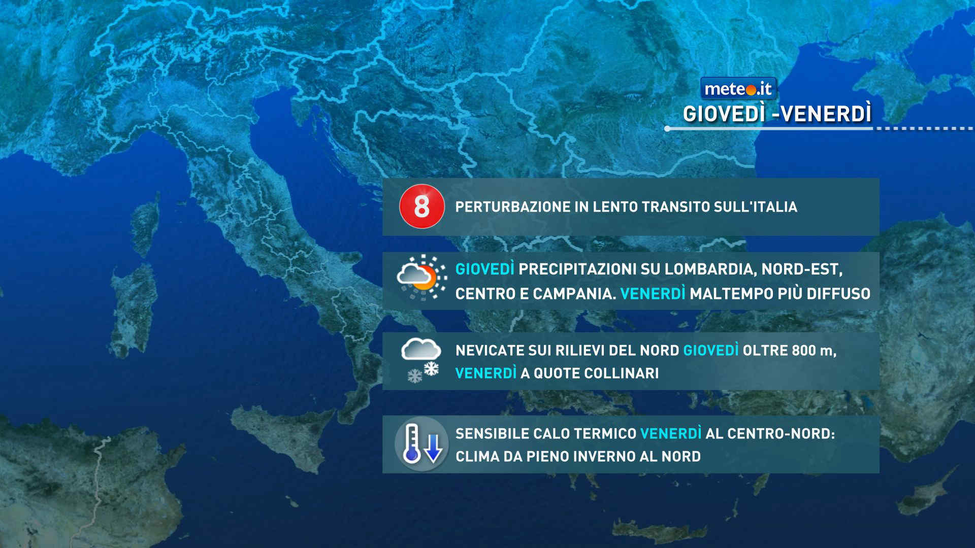 Temperature per lo più in calo: valori sotto la media al Centro-Nord e in Sardegna. Clima da pieno inverno al Nord. Ventoso al Sud e sulle Isole. Molto mossi o agitati i mari a ovest di Corsica e Sardegna e lo Ionio.