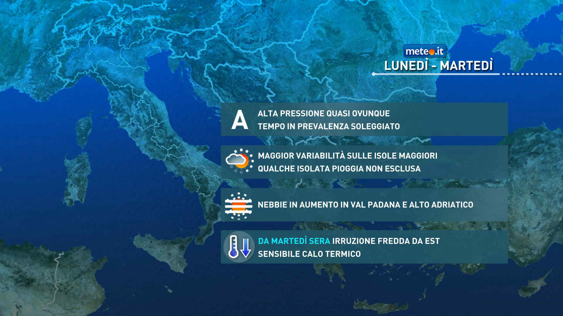 Tempo ben soleggiato in quasi tutta Italia. Soltanto tra Calabria meridionale, Sicilia e Sardegna il cielo potrà presentarsi ancora in parte nuvoloso con basso rischio di piogge. Nebbie notturne e mattutine nella fascia centrala della pianura padana e localmente nelle valli interne del Centro, in graduale diradamento. Locali deboli gelate mattutine al Nord.