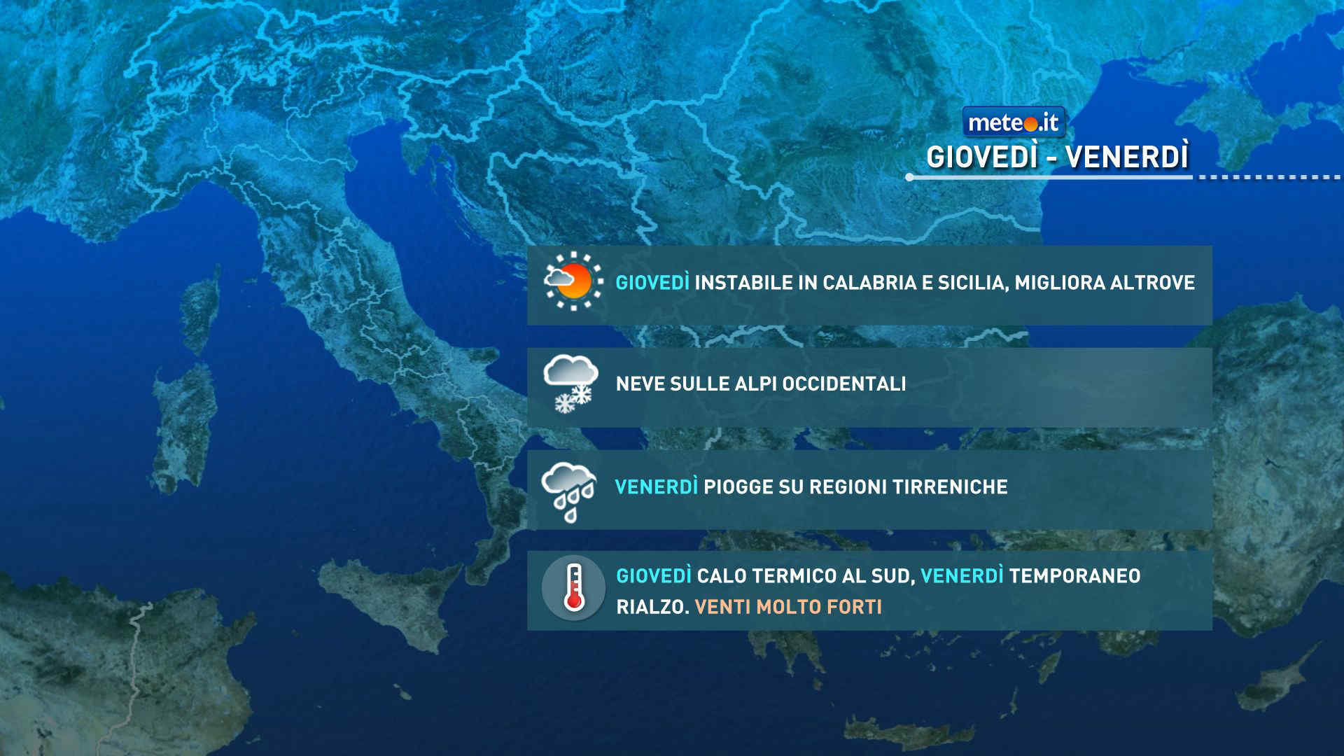 Il freddo e il maltempo dei prossimi giorni saranno accompagnati anche da una ventilazione intensa: in particolare, giovedì venti forti, occidentali o di Maestrale, soffieranno soprattutto al Sud e Isole; venerdì intensi venti occidentali spazzeranno gran parte del Centro-Sud e le Isole, mentre sabato sono attesi venti settentrionali su gran parte della Penisola, con possibili raffiche di tempesta su Isole e Tirreno.