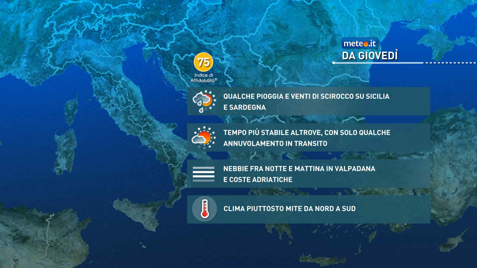 Nel resto d’Italia tempo decisamente più stabile e soleggiato specie nelle ore centrali del giorno mentre di notte e al mattino cieli grigi per nebbie e nubi basse, anche diffuse, sulla pianura padana centro-orientale e lungo tutto l’Adriatico dalle Venezie fino alla Puglia; qualche banco di nebbia si formerà anche nelle valli del Centro. Temperature senza grandi variazioni: massime pomeridiane fino a 15-16 gradi al Nord, 17-19 al Centro-Sud.
