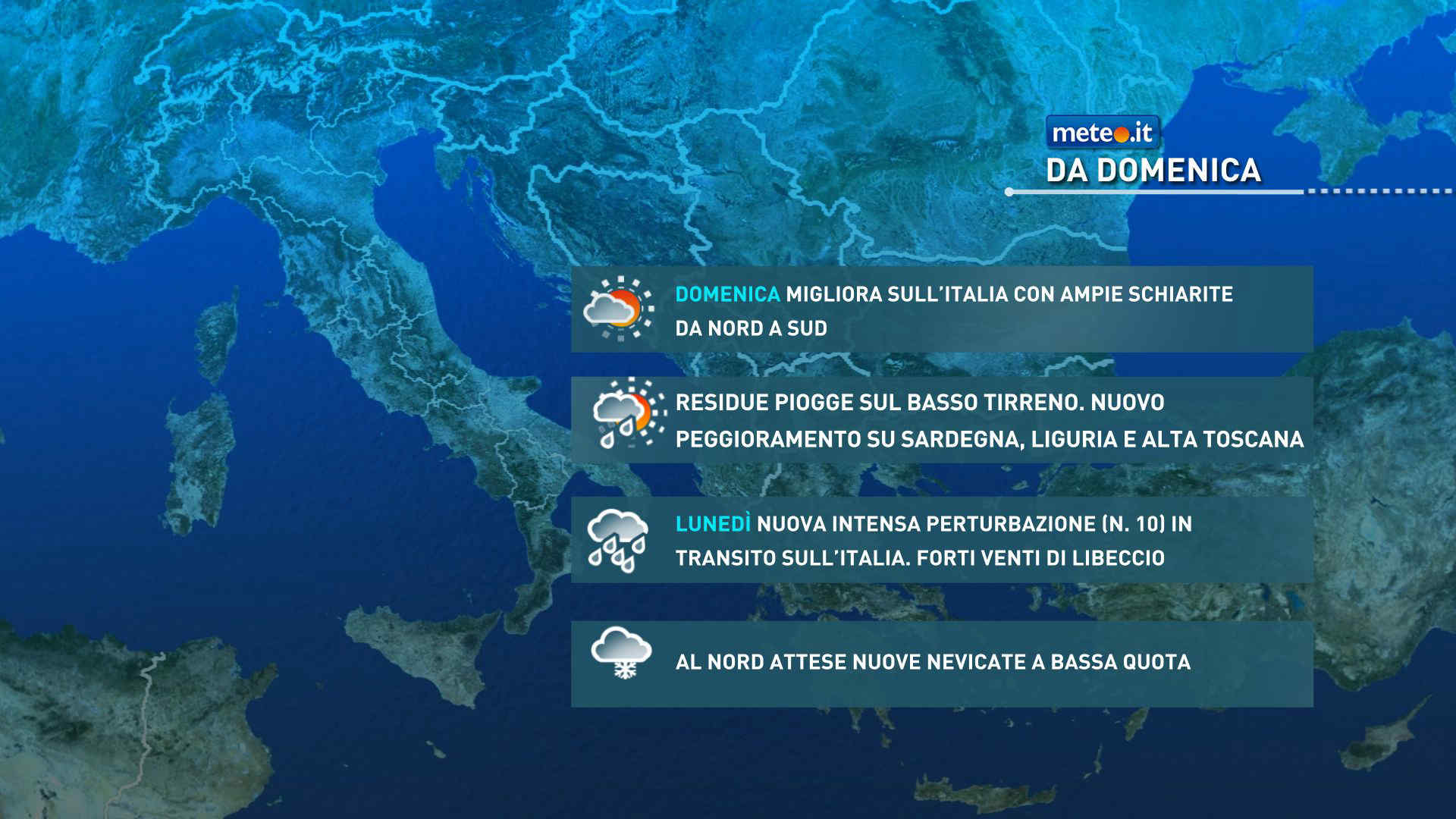 Lunedì 24 la parte più attiva della perturbazione attraverserà rapidamente anche il resto d’Italia. Le precipitazioni associate saranno in trasferimento dal Nordovest al Nordest con i fenomeni più significativi lungo le Alpi e quota neve piuttosto bassa in Piemonte e Valle d’Aosta, almeno oltre i 500-700 metri altrove. Precipitazioni sparse anche a carattere di rovescio o isolato temporale su Toscana, Lazio, zone interne del Centro, Campania e Sardegna e fenomeni più scarsi anche se non del tutto assenti sul medio Adriatico. Più a sud si dovrebbe trattare solo del passaggio di una nuvolosità irregolare e variabile. Le temperature saranno in rialzo nelle minime al Nord, nel settore tirrenico e in Sardegna; massime per lo più in aumento eccetto al Nordovest e sulla Val Padana centrale; al Centrosud l’afflusso di aria più mite sarà accompagnato da venti di Libeccio da moderati a forti.
