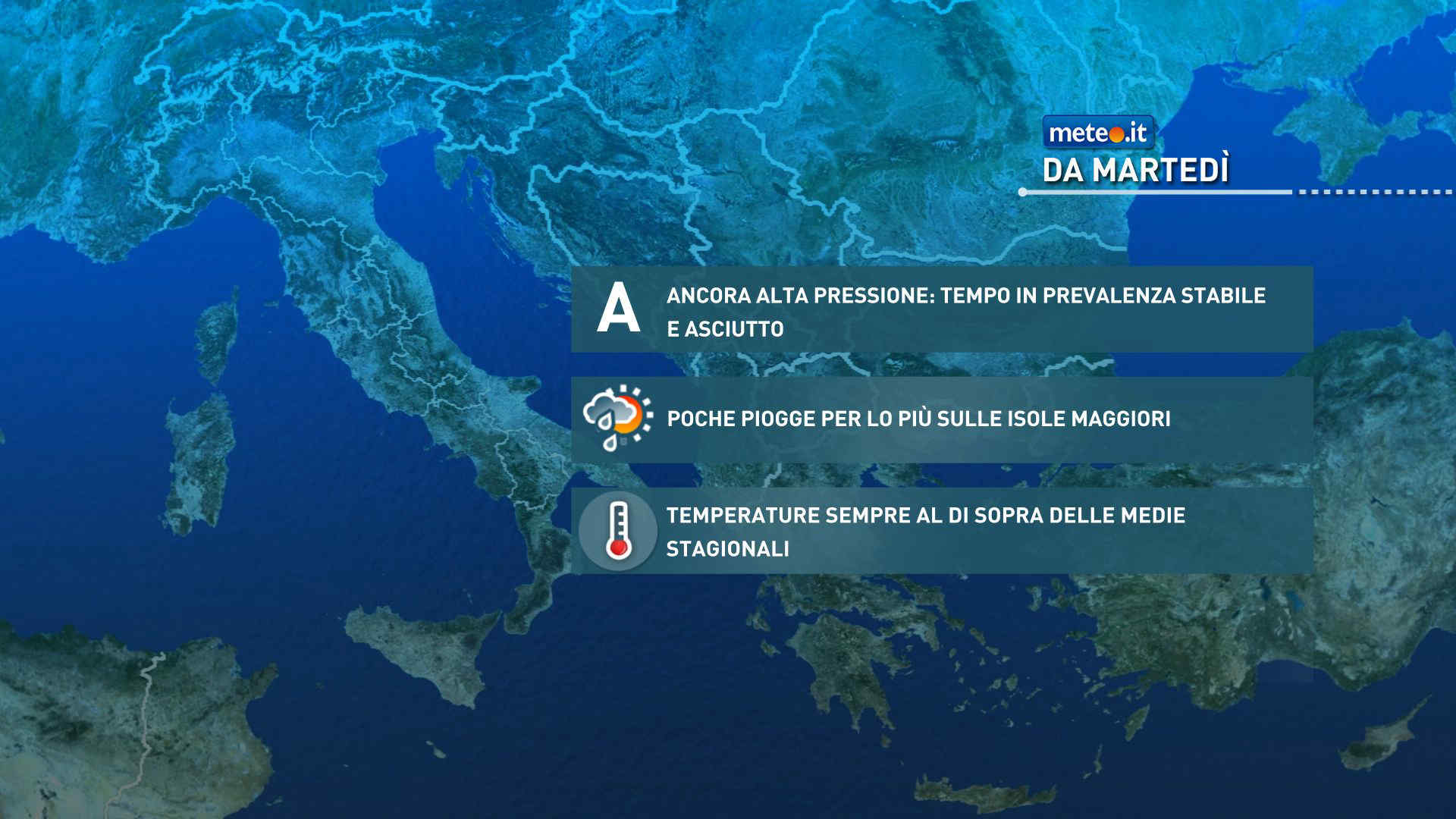 Nella parte centrale della settimana su gran parte dell’Europa centro-meridionale e orientale prevarrà un vasto campo di alta pressione, capace di assicurare prevalenti condizioni di stabilità atmosferica e cieli spesso sgombri da nubi significative. Il flusso atlantico, dunque, sarà ancora ostacolato nel suo naturale moto verso est e costretto a piegare verso la Penisola iberica e l’Africa nord-occidentale dove tenderà ad isolarsi una circolazione ciclonica la quale, molto lentamente, tenterà di avanzare verso le Isole maggiori, riuscendovi solo in parte.