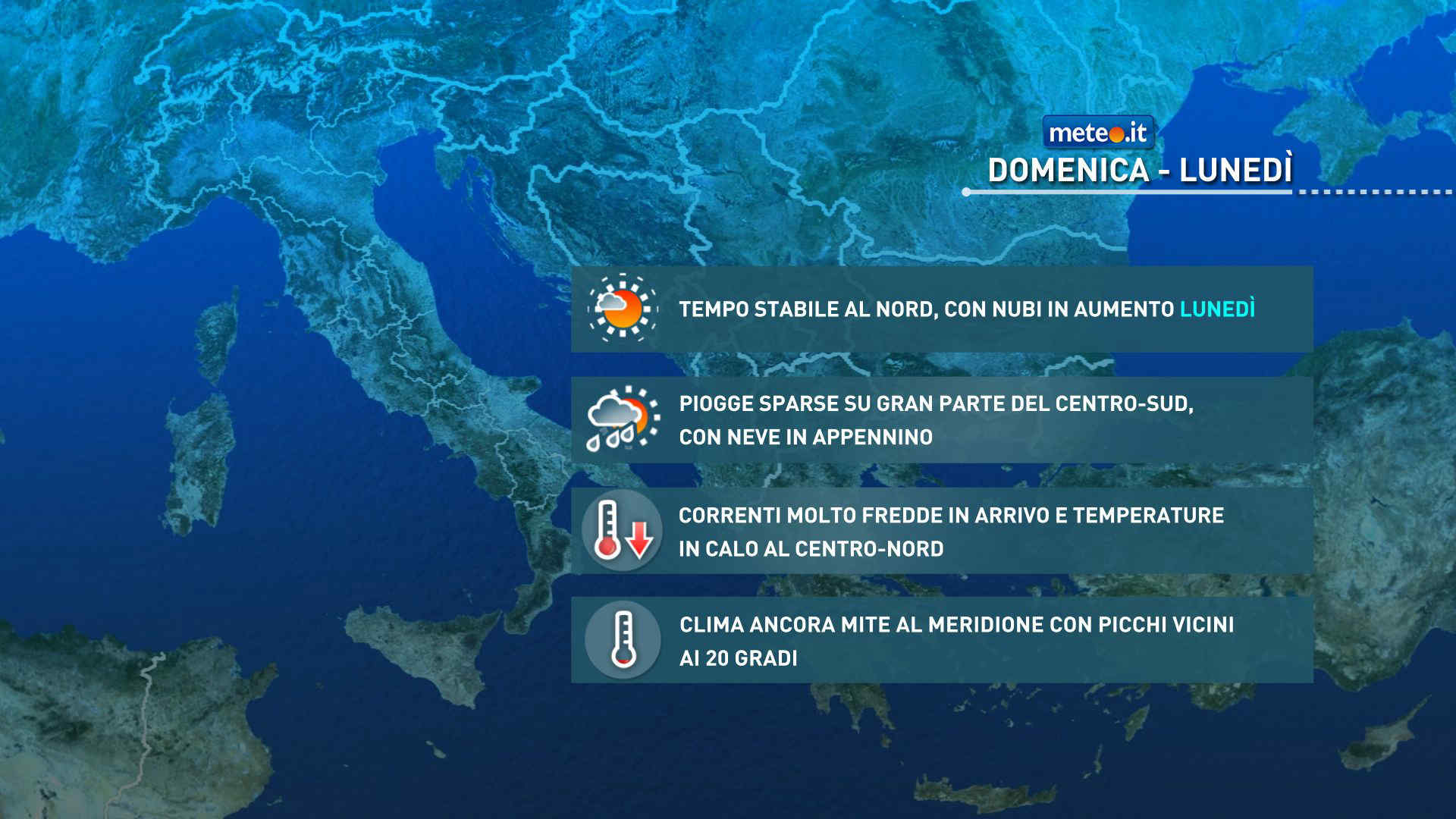 Lunedì prevalenza di tempo bello sull’arco Alpino. Nuvole sul resto d’Italia: nel corso del giorno piogge sparse su bassa Toscana, Umbria, Lazio, Marche, Abruzzo, Molise, Campania, Basilicata, Puglia, nord della Calabria e Sardegna settentrionale; neve sull’Appennino Centrale al di sopra di 800-1300 metri. Temperature minime in calo nelle regioni centrali, Campania e Sardegna, con gelate mattutine diffuse al Centro-Nord; massime con poche variazioni nelle Isole maggiori, in diminuzione altrove.