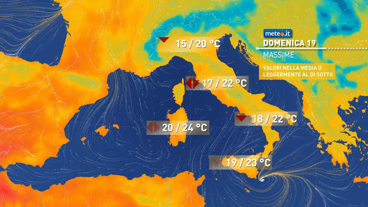 Temperature massime in calo al Nord, più marcato al Nord-Ovest dove potranno scendere anche sotto i 15 gradi; valori pressoché stazionari al Centro-Sud, con punte dai 20 ai 23 gradi. Venti deboli, a parte dei rinforzi da sud nei mari più occidentali.