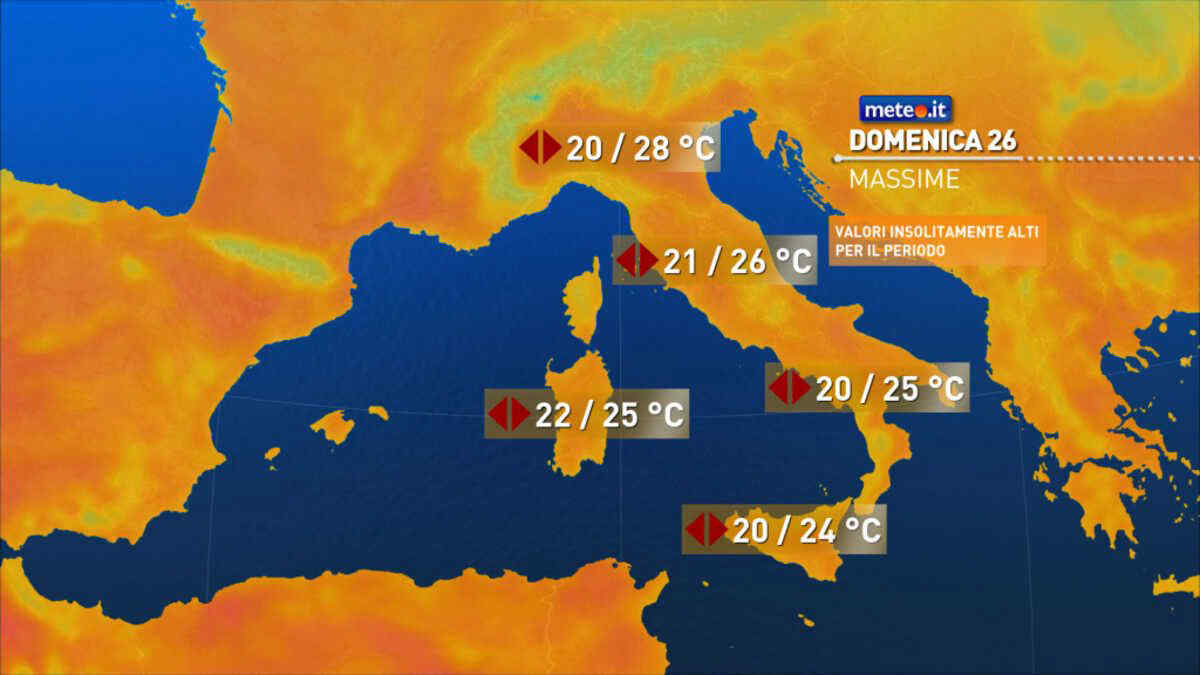 Temperature massime in leggera diminuzione al Nord, pressochè invariate al Centro-Sud e nelle Isole: valori sempre al di sopra delle medie stagionali praticamente in tutta Italia.
