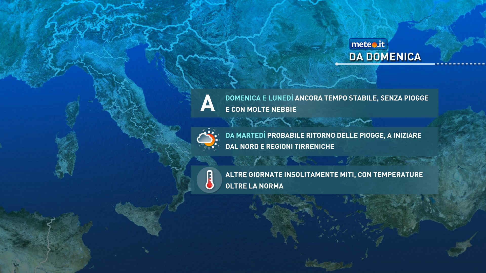 Domenica prevarrà ancora l’influsso dell’alta pressione e sulla maggior parte delle regioni il cielo sarà privo di nuvolosità significativa. Farà eccezione solo qualche annuvolamento nel sud della Puglia, in Calabria, in Sardegna e in Liguria. Nelle ore più fredde ci sarà il rischio di nebbie sul settore orientale della pianura padana. I venti saranno deboli e le temperature caleranno lievemente al Nord, pur restando su valori in generale superiori alle medie stagionali.