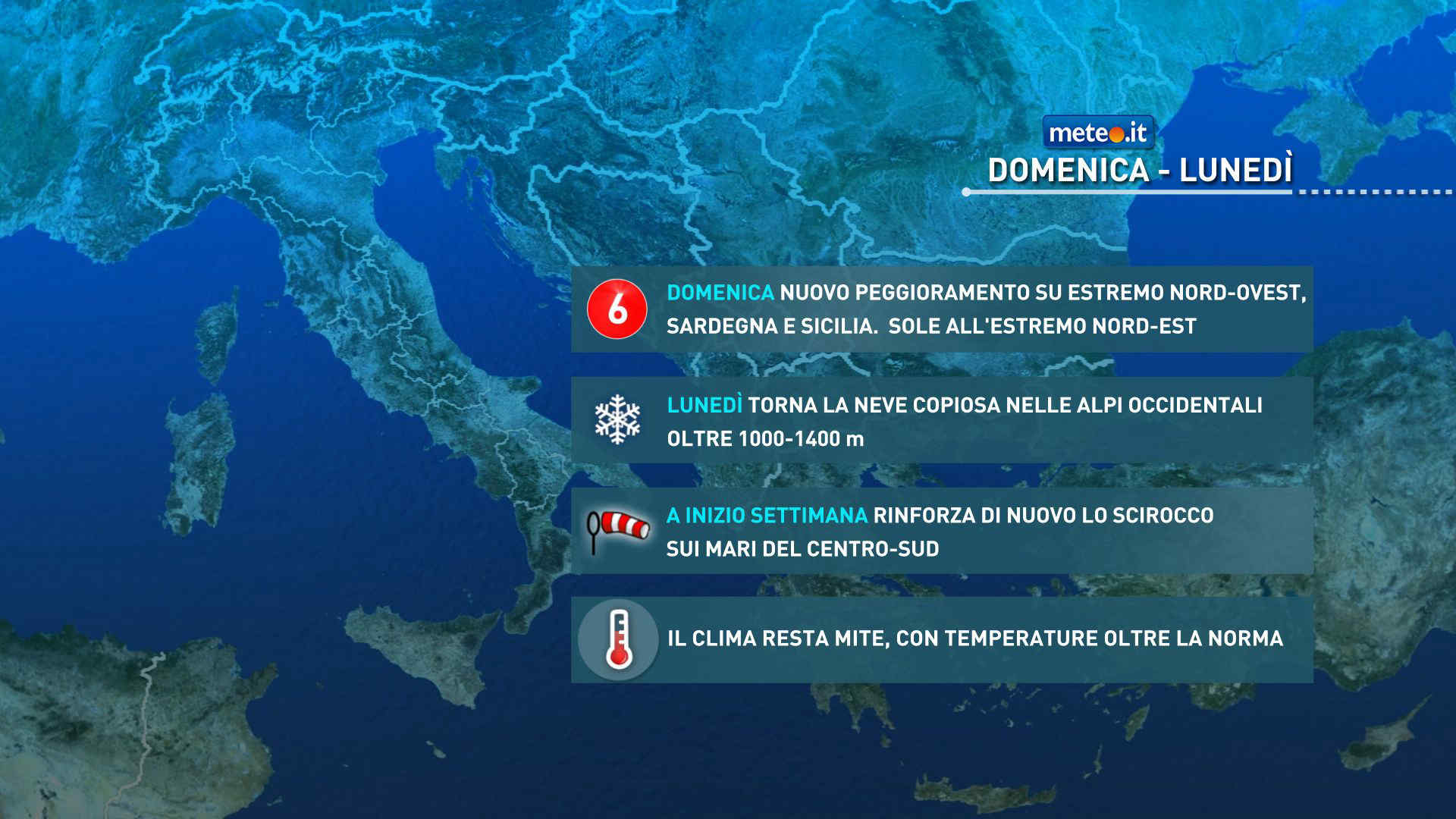 Neve sulle Alpi occidentali oltre 1200-1500 metri, a quote inferiori (900-1000 m.) tra il Cuneese, le Alpi Marittime e il Savonese dove i fenomeni potranno risultare intensi e abbondanti. Temperature massime in lieve calo al Nord-Ovest, in lieve aumento al Centro-Sud. Venti moderati o tesi di Scirocco sui mari centro-meridionali, di Tramontana in Liguria.