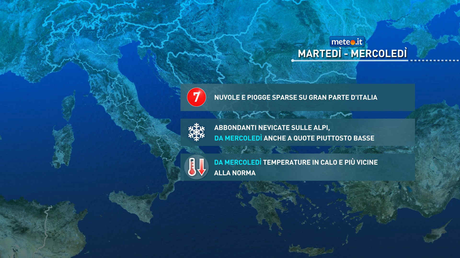 Martedì giornata in generale nuvolosa o molto nuvolosa in tutta Italia. Nel corso del giorno piogge sparse su quasi tutte le regioni, a eccezione di Alta Lombardia, Trentino, Alto Adige e Friuli; nevicate sulle Alpi Occidentali, anche abbondanti, al di sopra di 1000-1200 metri. Temperature massime ancora al di sopra della norma quasi dappertutto, seppur in calo di qualche grado nelle nostre due isole maggiori; stazionarie o in leggero aumento altrove. Venti da moderati a forti di Tramontana in Liguria; meridionali nel Tirreno, sulle due Isole maggiori, nello Ionio e nell’Adriatico centro-meridionale. Venti moderati orientali sull’alto Adriatico. Mari mossi o molto mossi.