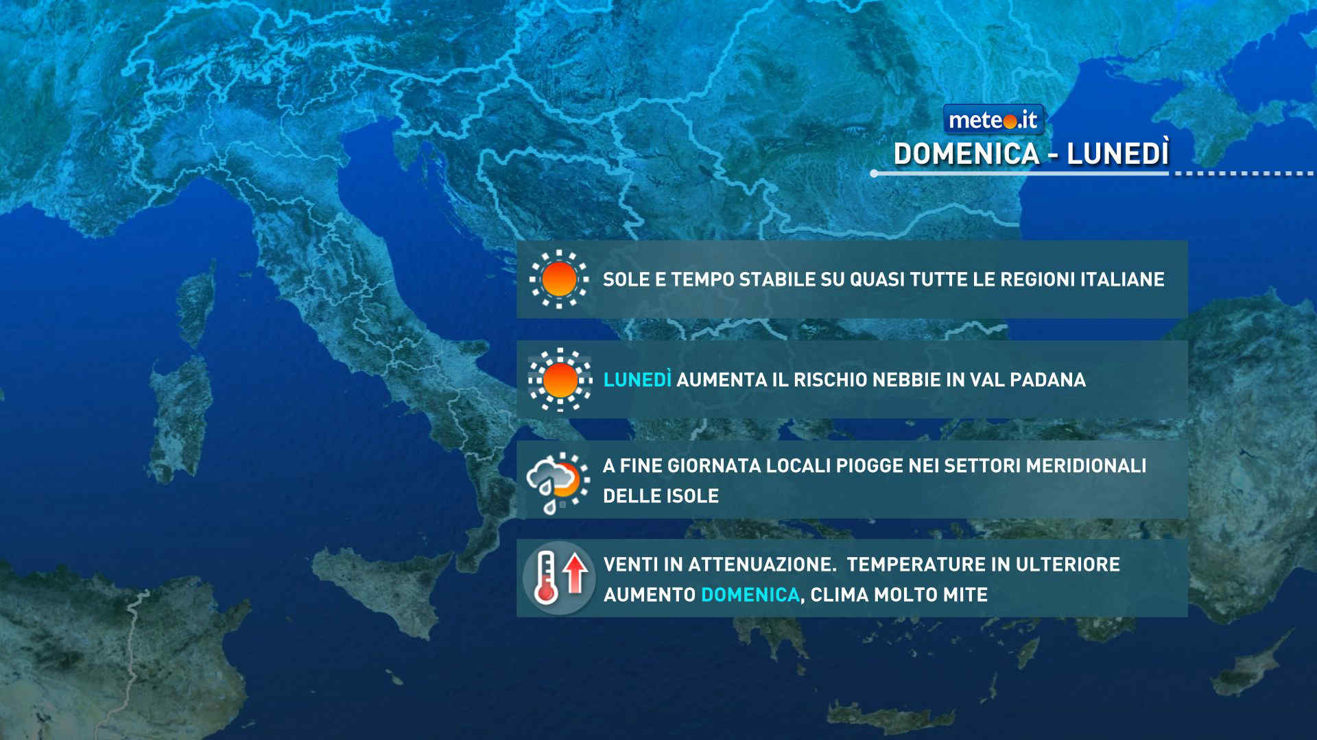 Questa fase di stabilità atmosferica è accompagnato da un clima diurno mite, specie al Centro-Nord; lunedì 29 sulle Alpi lo zero termico sfiorerà i 3000 metri di quota.