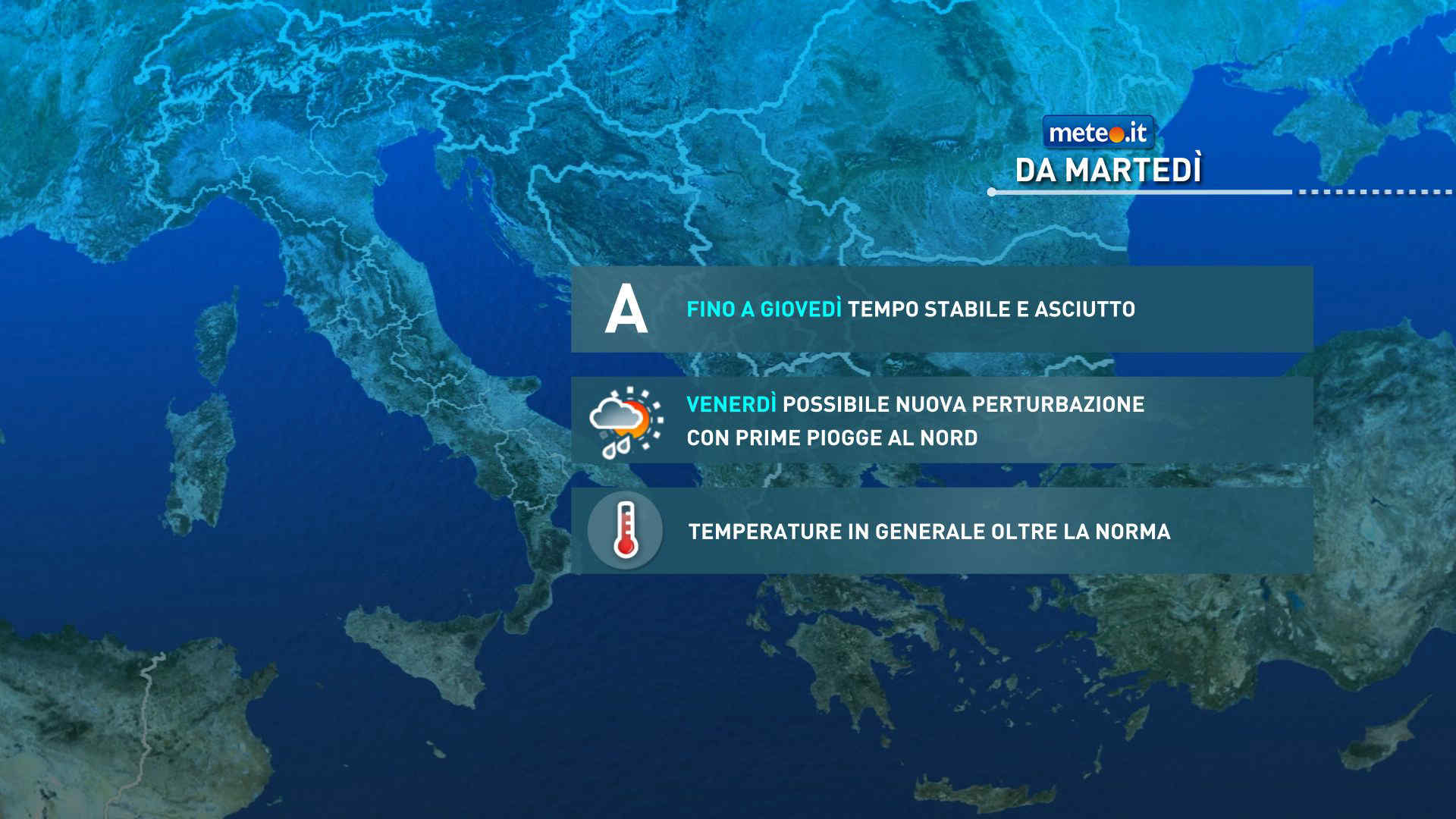 Sulle nostre regioni, quindi, prevarranno condizioni di stabilità, ma con probabile formazione di nebbie ed estesi banchi di nubi basse su pianure e valli e a ridosso delle coste liguri, tirreniche e dell’Adriatico settentrionale. La struttura anticiclonica sarà accompagnata dall’arrivo di una massa d’aria molto mite che favorirà un rialzo generalizzato delle temperature su valori superiori alle medie stagionali, su livelli da inizio primavera.